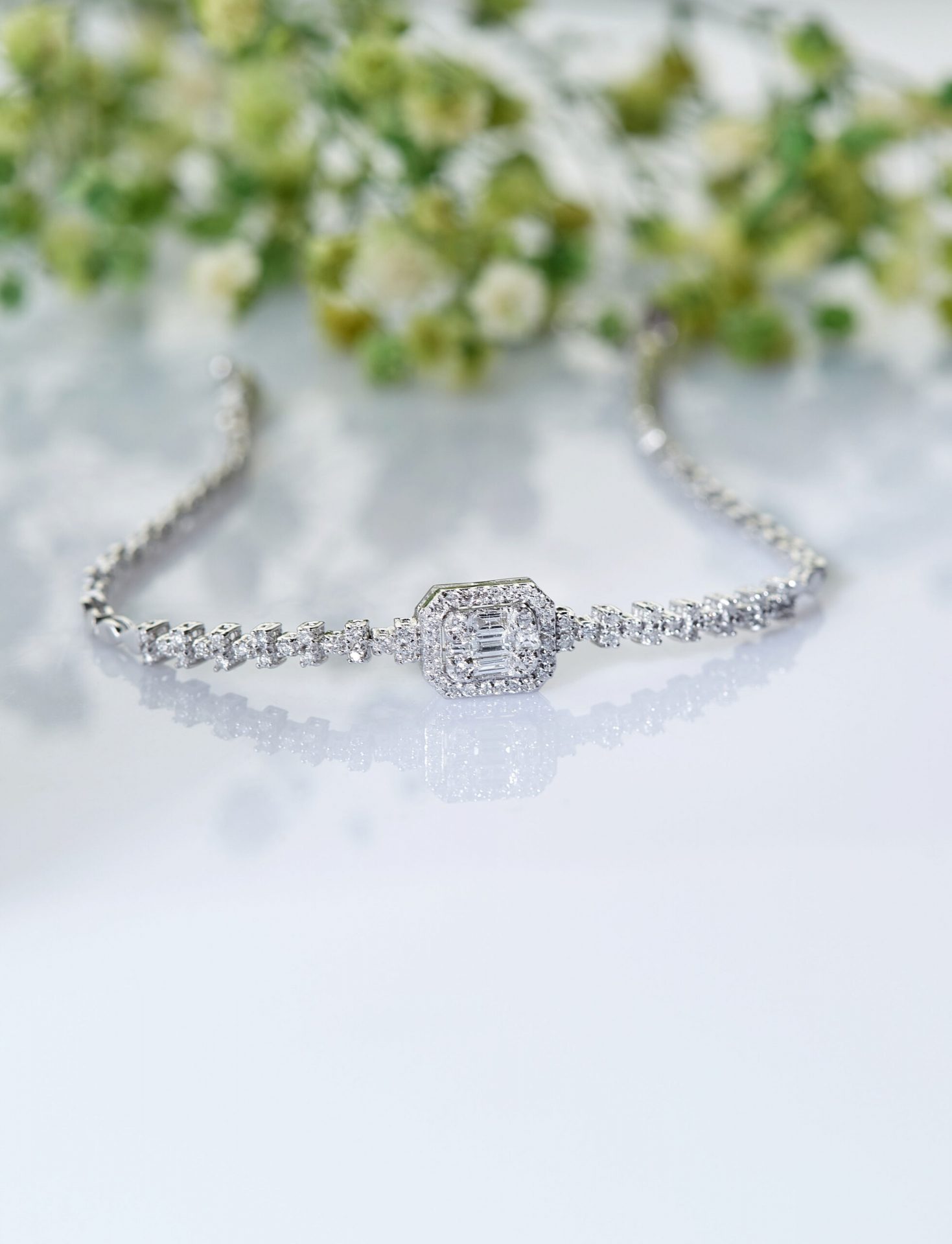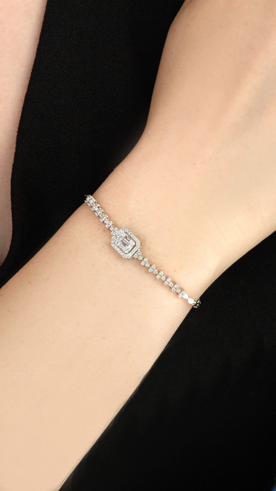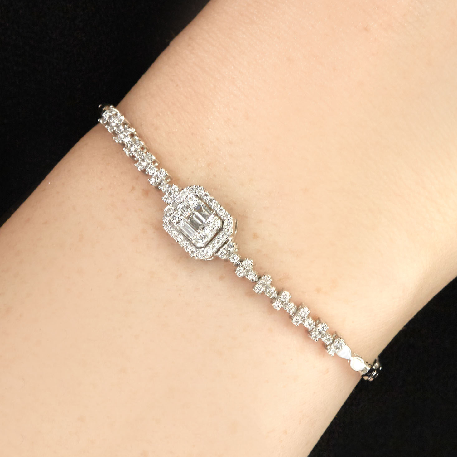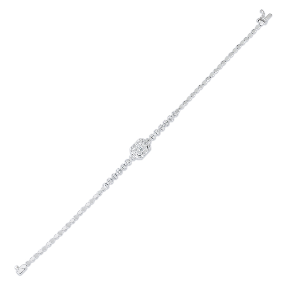 Das feligrane MEINSCHMUCK Armband erstrahlt in 585er Weißgold und besticht mit seinen Brillanten (ca.0,66ct., gesamt). Die feinweißen Brillanten im Baguette- und Brillantschliff sind in wunderschöner Form angeordnet und sind die perfekte Kombination zu dem glänzenden 585er Weißgold und bringen das Armband noch mehr zum Funkeln. Durch die edlen Materialien und die präzise Verarbeitung werden Sie noch in vielen Jahren Freude an dem Armschmuck haben. Dazu beitragen wird auch die hochwertige Rhodinierung des Weißgoldes, die das Armband vor dem Anlaufen schützt. Das Armband wird mit einem praktischen Kastenverschluss verschlossen und ermöglicht so ein schnelles und einfaches An- und Ablegen. Das edel-glänzende und bezaubernd-funkelnde Armband passt zu allen Stilrichtungen und den verschiedensten Looks, daher eignet er sich auch wunderbar als Geschenk.