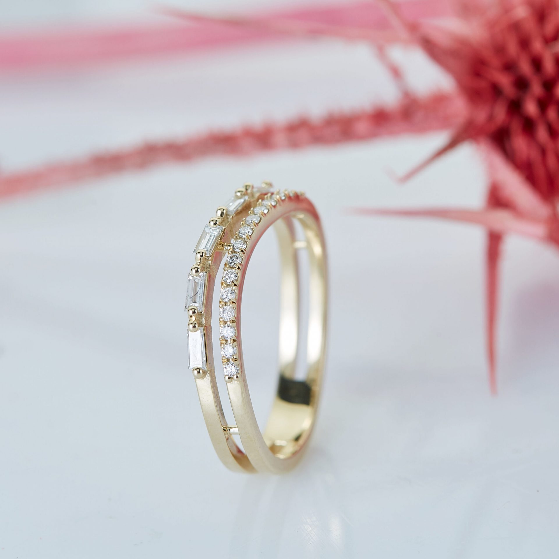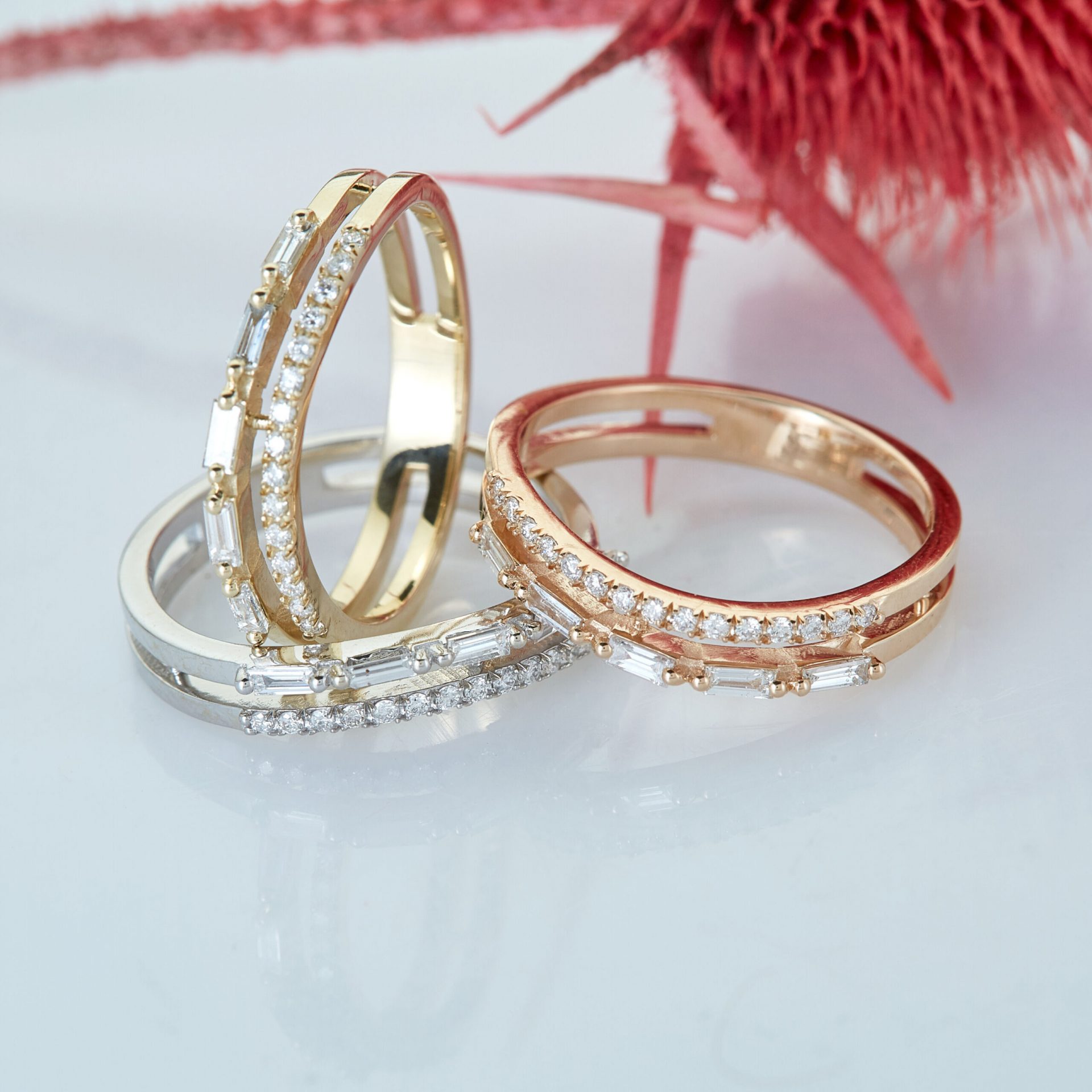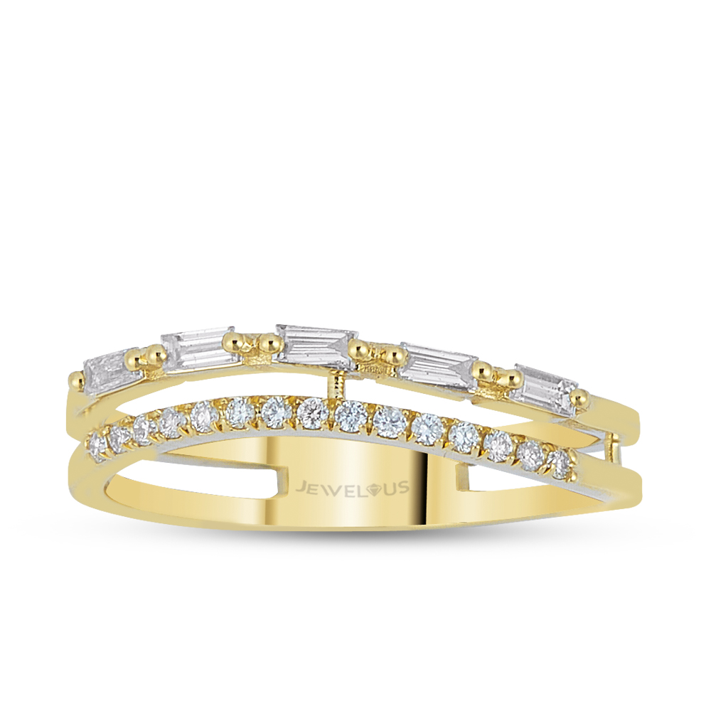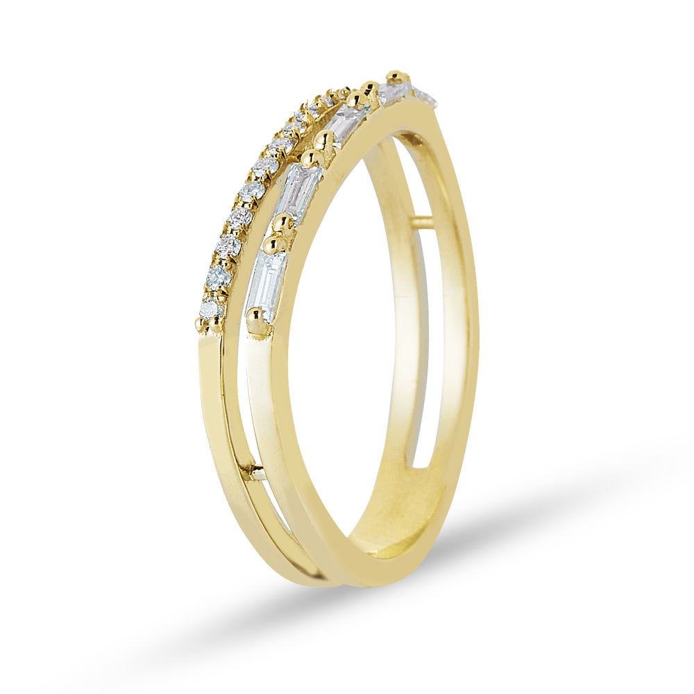 Ein einfarbiger MEINSCHMUCK Diamantring – mit schwungvollem Design – mit 585er gelbgoldenem Glanz und zweireihiger dezent geschwungener Ringschiene. Die Verschnittfassungen rückt die Diamanten ( ca. 0,25 ct. ) im Brillant- und Baguetteschliff perfekt in Szene. Diese Kombination aus der geschwungenen zweireihigen Ringschiene aus 585er Gold und dem exklusiven Steinbesatz, macht aus dem filigranen Ring ein optisch abwechslungsreiches Schmuckstück, das zu zahlreichen Looks passen wird. Wir legen bei unserem Diamantschmuck nur Wert auf eine exzellente Qualität. Dieser Goldring ist in den Farben Gelbgold, Weißgold und Rotgold erhältlich.