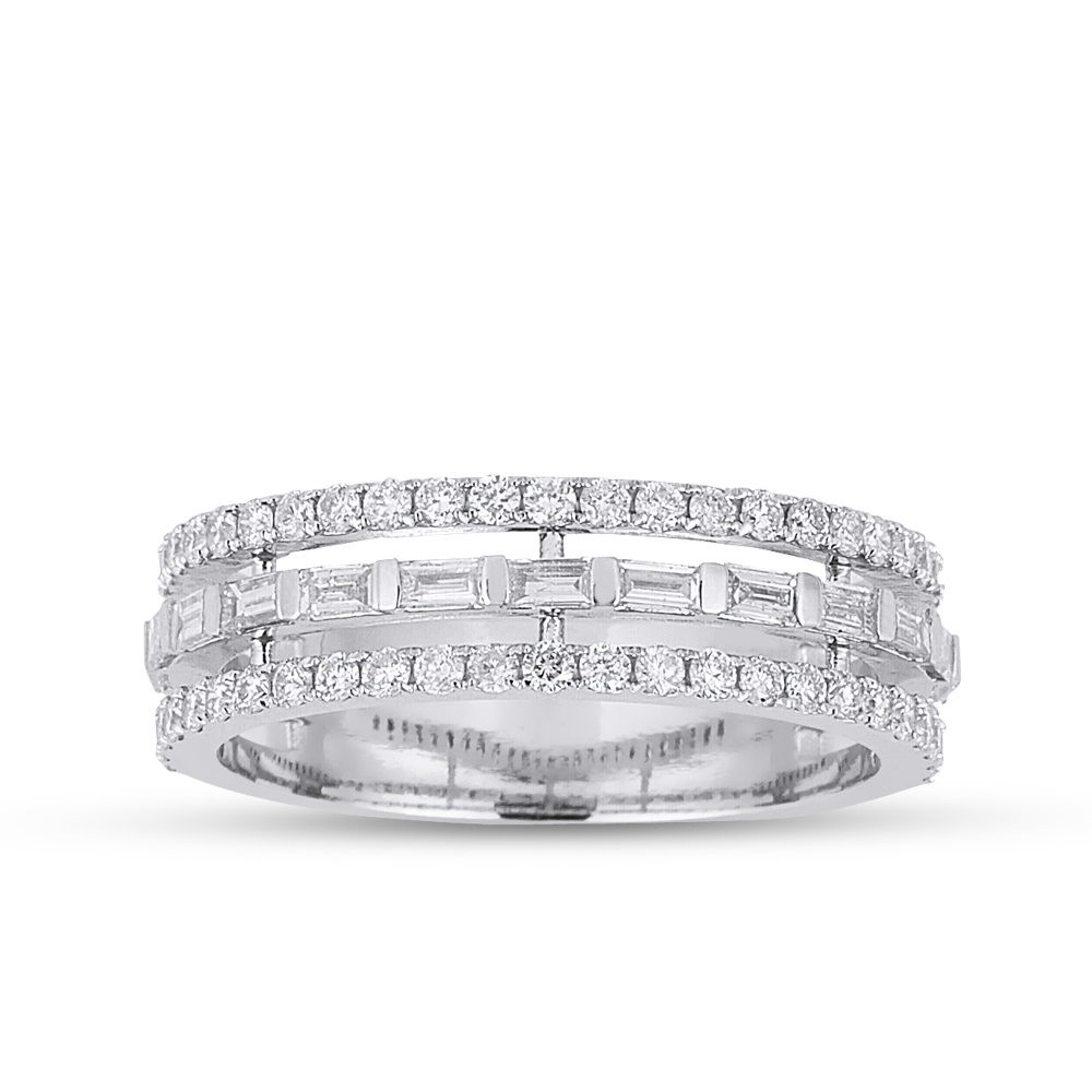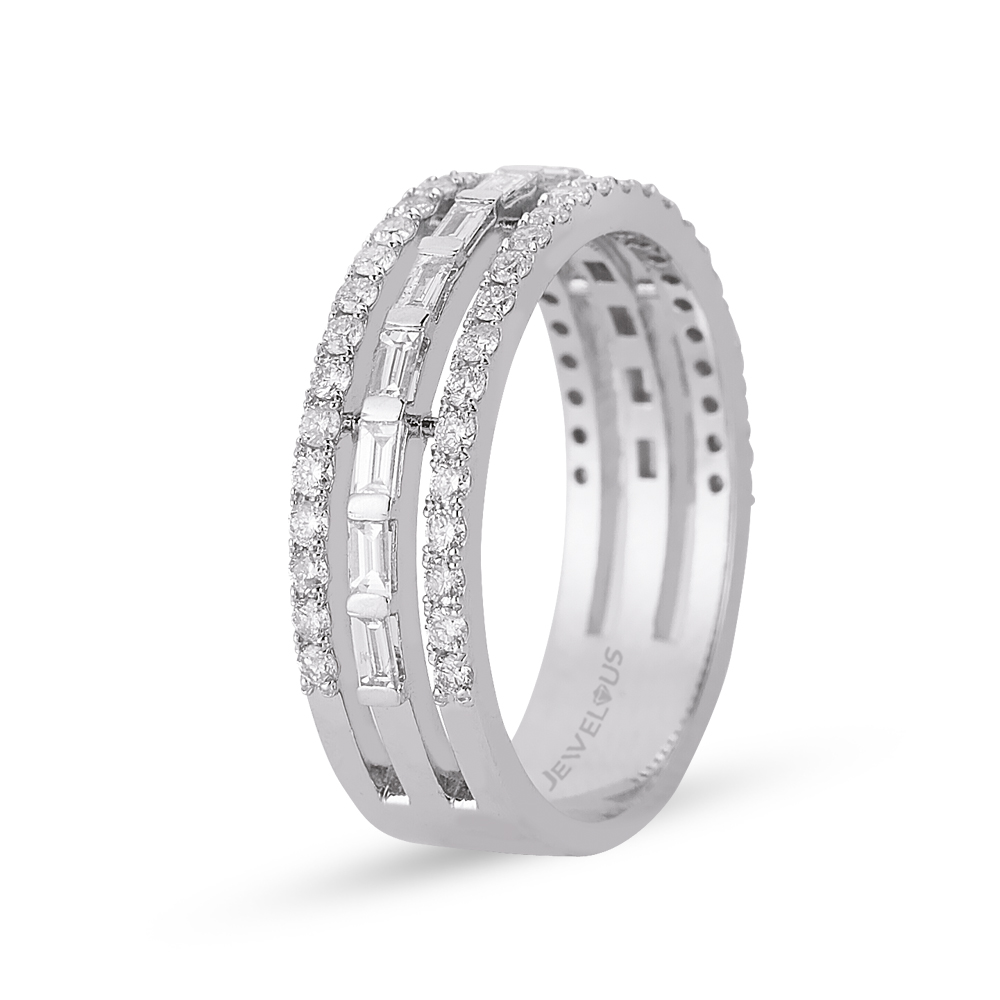 Ein absolutes Highlight dieser -MEINSCHMUCK Diamantring- mit weißgoldenem Glanz aus 585er Gold mit dreireihiger Schiene. Die Verschnittfassungen rückt die Diamanten ( ca. 0,50 ct. ) im Brillantschliff und die Diamanten ( ca. 0,32 ct. ) im Baguetteschliff perfekt in Szene. Diese Kombination aus Brillant- und Baguetteschliff, der dreireihigen Ringschiene, dem exklusiven Steinbesatz, macht aus dem filigranen Ring ein optisch abwechslungsreiches Schmuckstück, das zu zahlreichen Looks passen wird. Wir legen bei unserem Diamantschmuck nur Wert auf eine exzellente Qualität. Dieser Goldring ist in den Farben Gelbgold, Weißgold und Rotgold erhältlich.