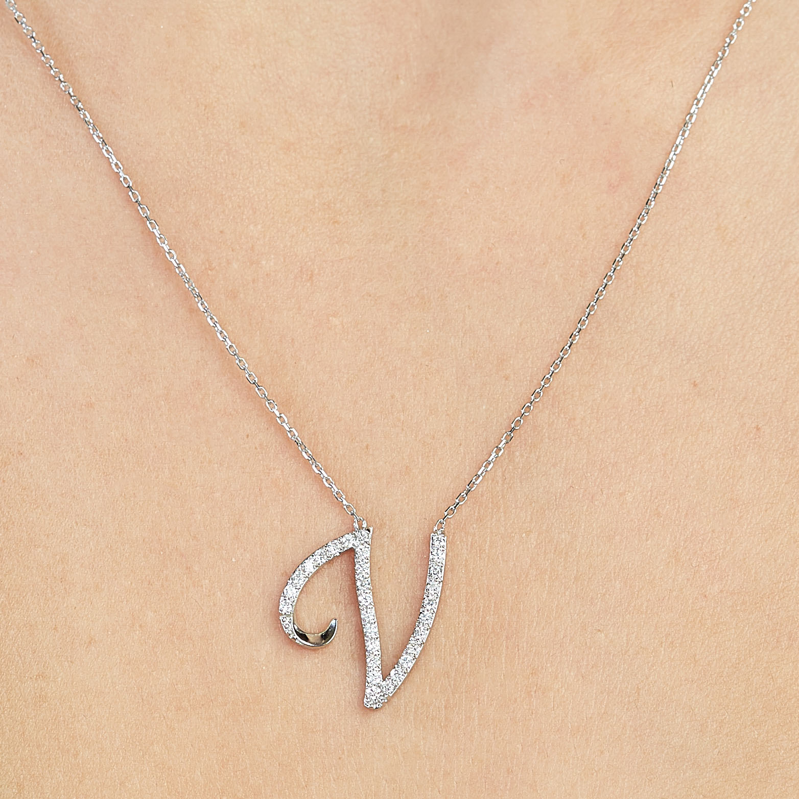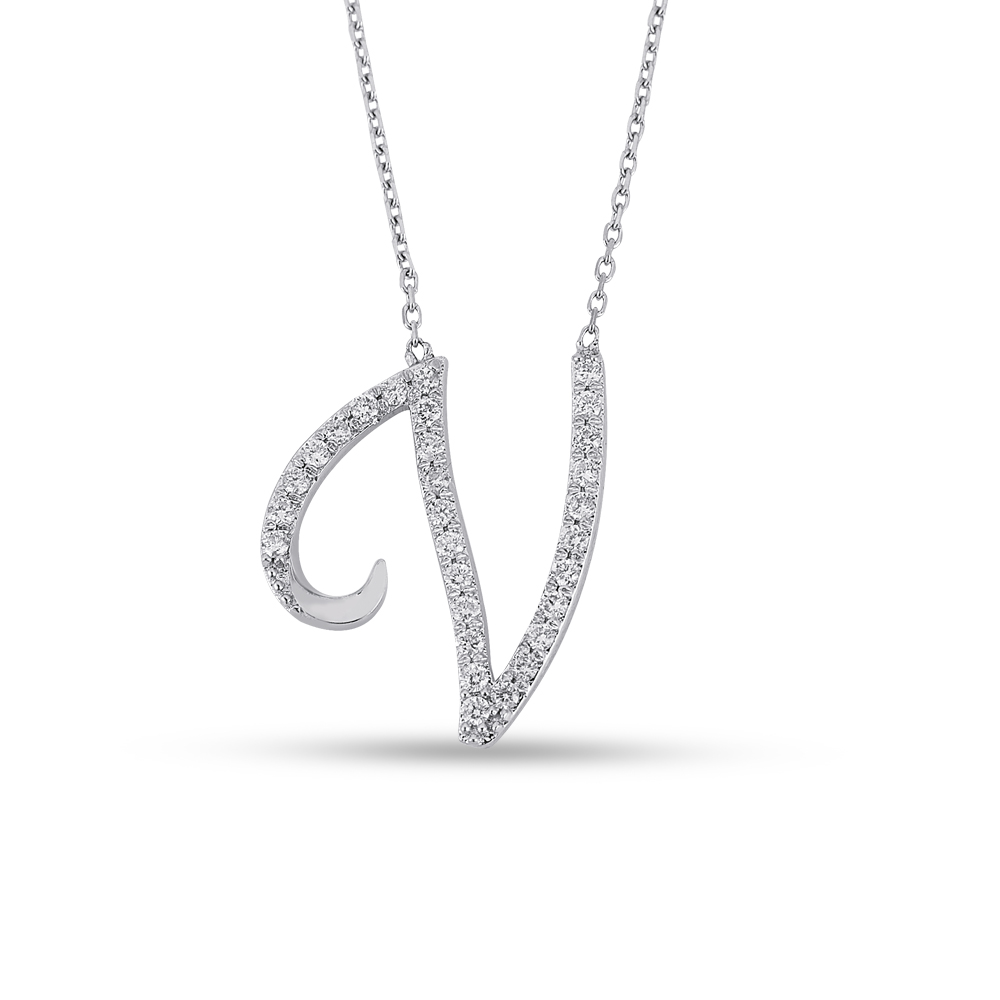 Ein MUST HAVE – diese MEINSCHMUCK Buchstabenkette V aus 585er Weißgold mit Diamanten (ca. 0,20ct.) im Brillantschliff. Man sieht dem Schmuckstück bereits auf den ersten Blick seine hochwertigen Materialien und die ausgezeichnete Verarbeitung an – formvollendet zeitgemäß. Die feingliedrige Ankerkette garantiert einen angenehmen Tragekomfort. Machen Sie sich selbst eine Freude, mit dieser wunderschönen Kette!