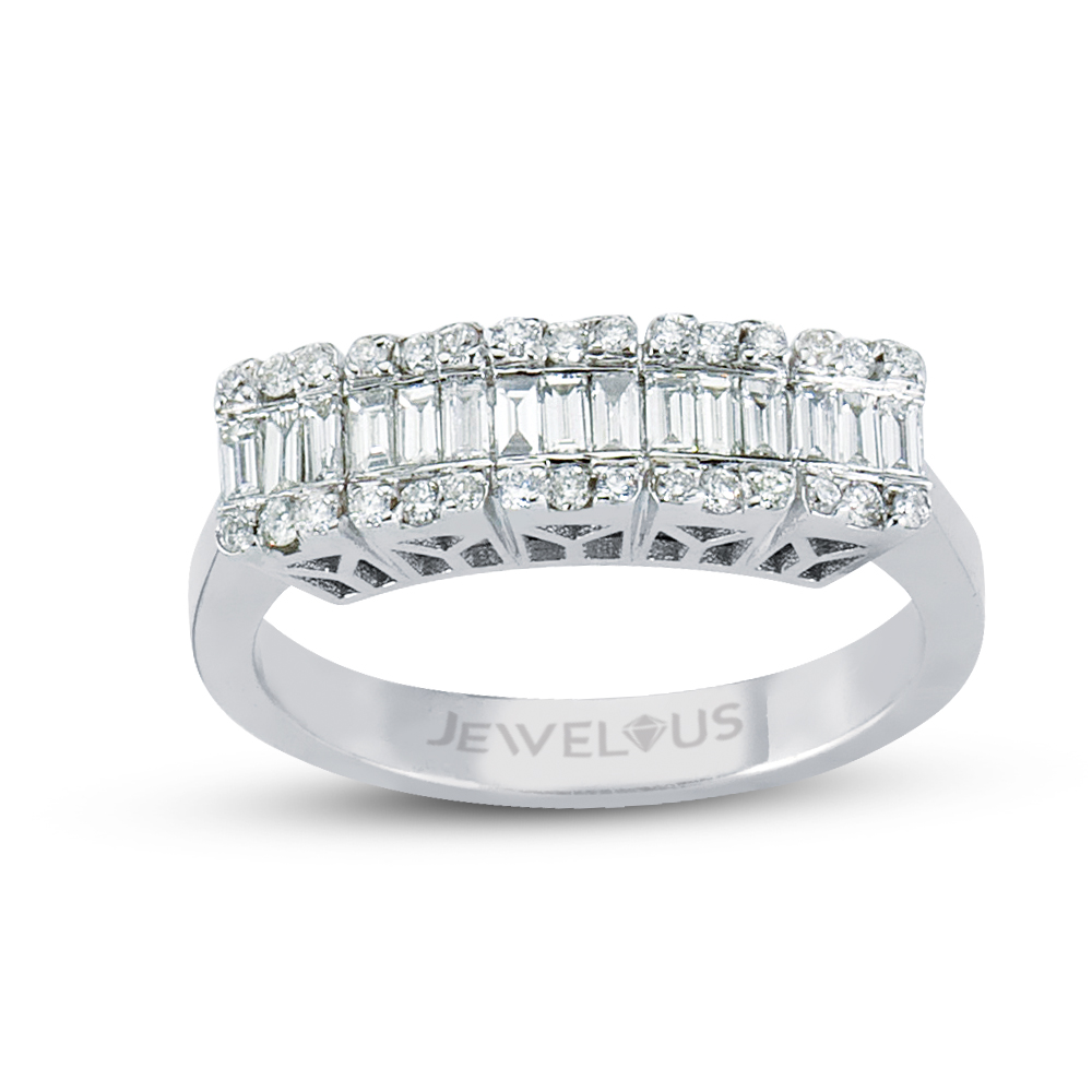 Ein Eyecatcher dieser -MEINSCHMUCK Diamant Ring- aus 585er Gold mit Brillanten in Hochfassung. Auf dem oberen Teil der Ringschiene dieses Rings aus 585er Weißgold versammeln sich mehrere Diamanten mit ca. 0,50ct. (gesamt) in quadratischer Form. Die Brillanten sind im Baguette- und Brillantschliff, im Weiteren verfügen sie über einen magischen Glanz, dem sich niemand entziehen kann. Insbesondere bei Lichteinfall entstehen atemberaubende Reflexionen. Je mehr Karat ein Diamant besitzt, desto größer ist sein Seltenheitswert und desto wertvoller ist er somit auch. Das Gold ist auf Hochglanz poliert, was seinen Schimmer noch mehr zum Vorschein bringt. Er ist ein Symbol unvergesslicher Momente, denn jeder Diamant kann für ein besonderes Ereignis stehen. Dieser wunderschöne Ring eignet sich wunderbar als Antragsring oder als Vorsteckring!