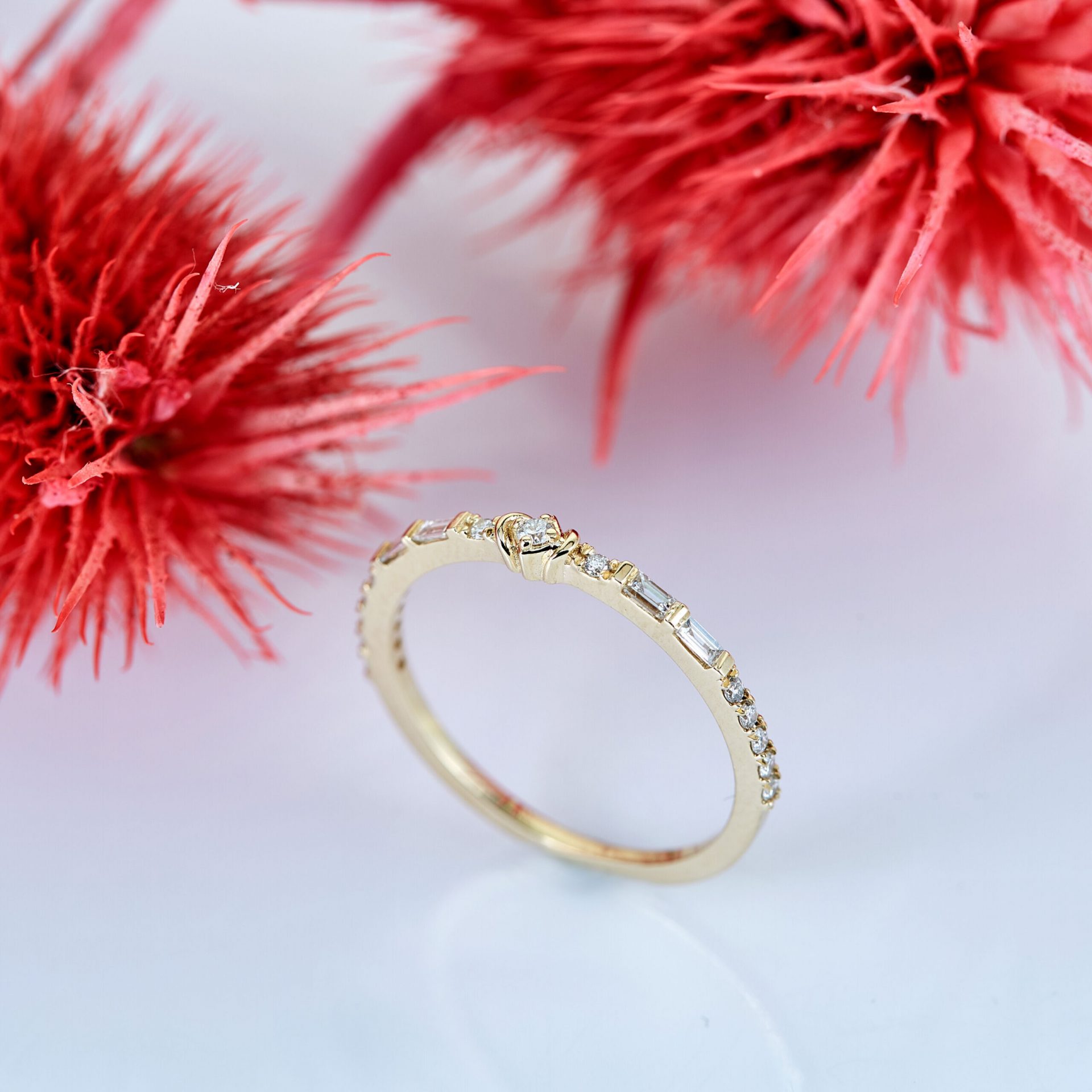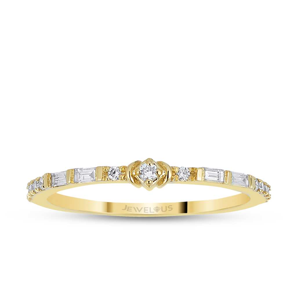 Ein einfarbiger – MEINSCHMUCK- Diamantring im romantischen Design mit gelbgoldenem Glanz. Die Verzierungen rücken die Brillanten ( ca. 0,11 ct. ) im Brillantschliff und die Brillanten im Baguetteschliff ( ca.0,09ct.) perfekt in Szene. Die in der Ringschiene aus 585er Gelbgold eingearbeiteten Zierelemente, in denen die Diamanten sitzen, sind mittig in einer Rauten-Form gehalten. Die Kombination aus modernem Gelbgold, dem exklusiven Steinbesatz, macht aus dem filigranen Ring ein optisch abwechslungsreiches Schmuckstück, das zu zahlreichen Looks passen wird. Wir legen bei unserem Diamantschmuck nur Wert auf eine exzellente Qualität. Dieser Goldring ist in den Farben Gelbgold, Weißgold und Rotgold erhältlich.