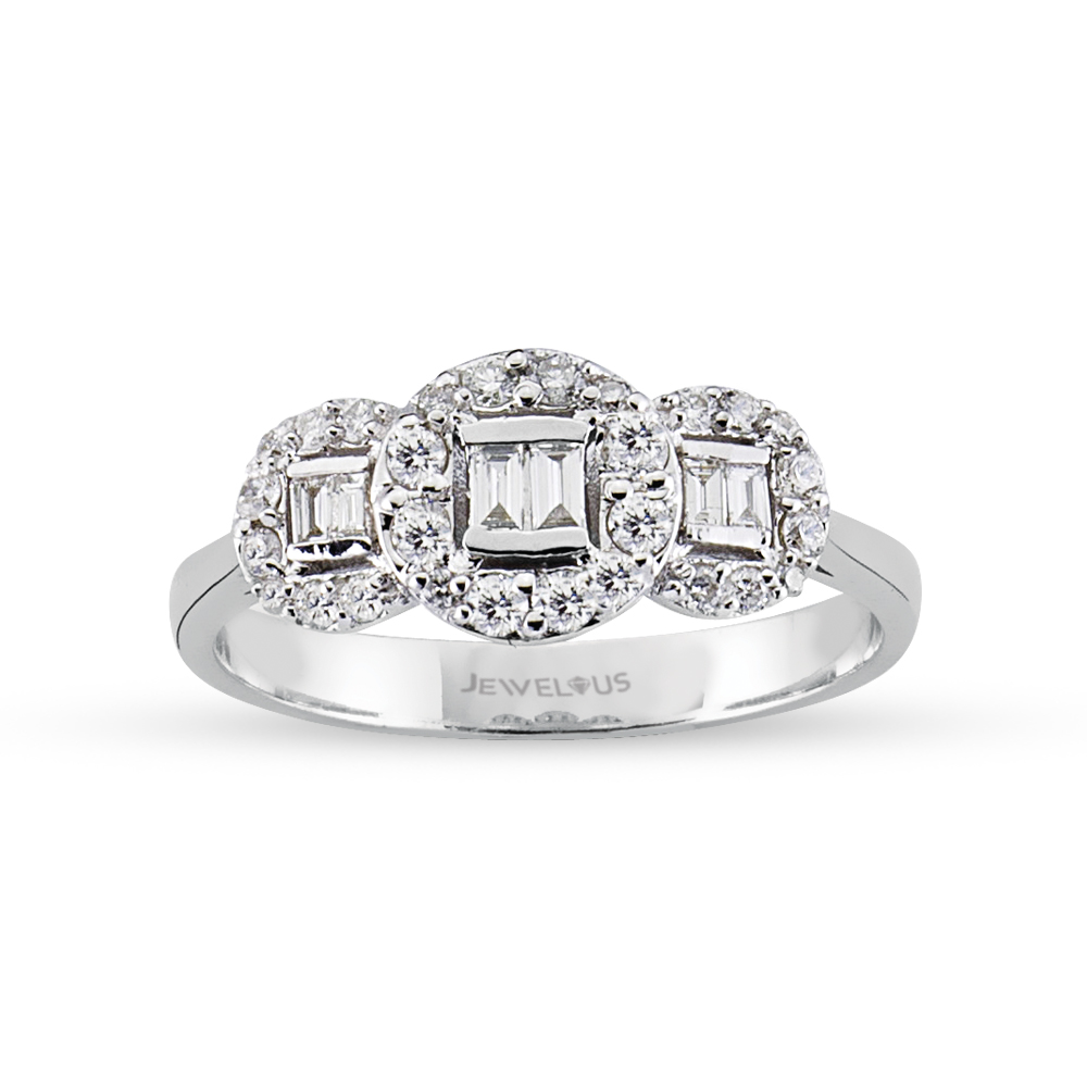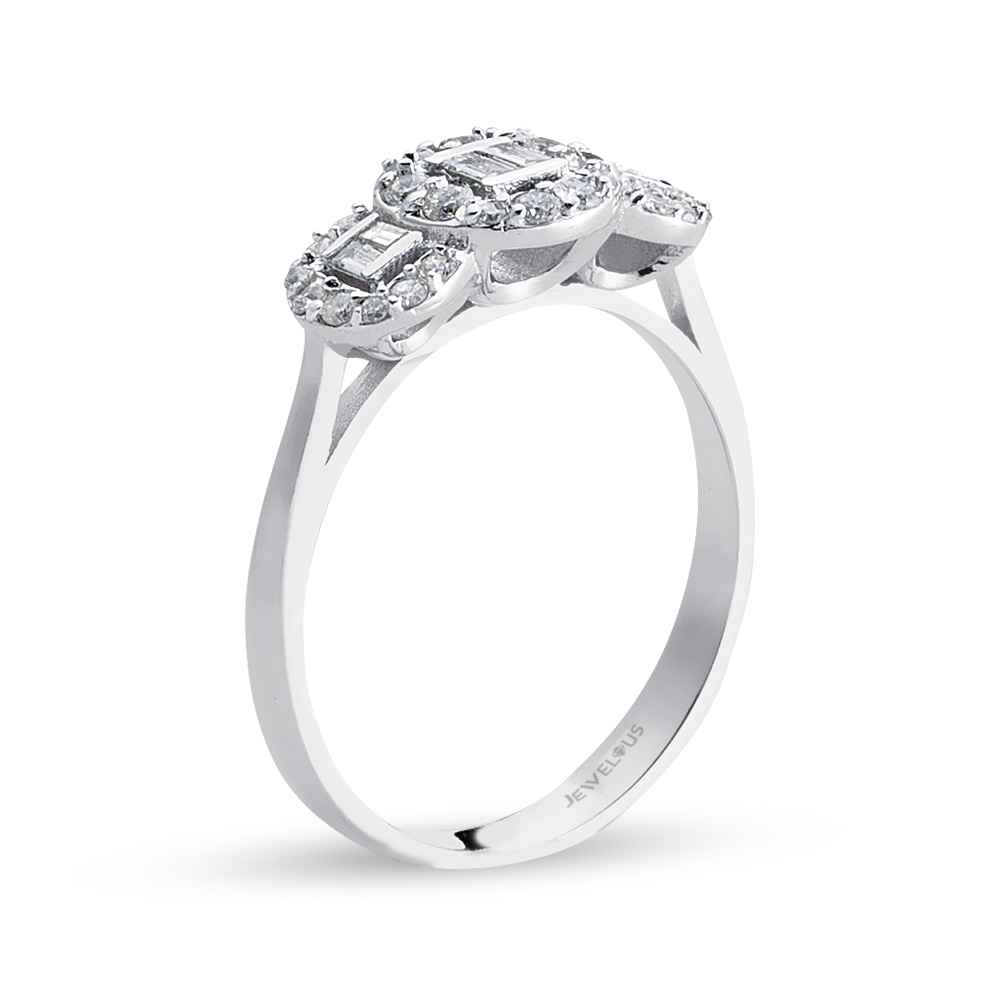Ein einfarbiger – MEINSCHMUCK- Diamantring im modischen Design mit weißgoldenem Glanz aus 585er Gold. Die drei kreisrunden Verzierungen rücken die Brillanten ( ca. 0,46 ct. ) im Brillant- und Baguetteschliff perfekt in Szene. In der Ringschiene aus 585er Weißgold sind drei kreisrunde Zierelement mit Brillanten eingearbeitet. Die Kombination aus modernem Weißgold, dem exklusiven Steinbesatz, macht aus dem filigranen Ring ein optisch abwechslungsreiches Schmuckstück, das zu zahlreichen Looks passen wird. Wir legen bei unserem Diamantschmuck nur Wert auf eine exzellente Qualität. Dieser wunderschöne Brillantring eignet sich auch wunderbar als Antragsring!