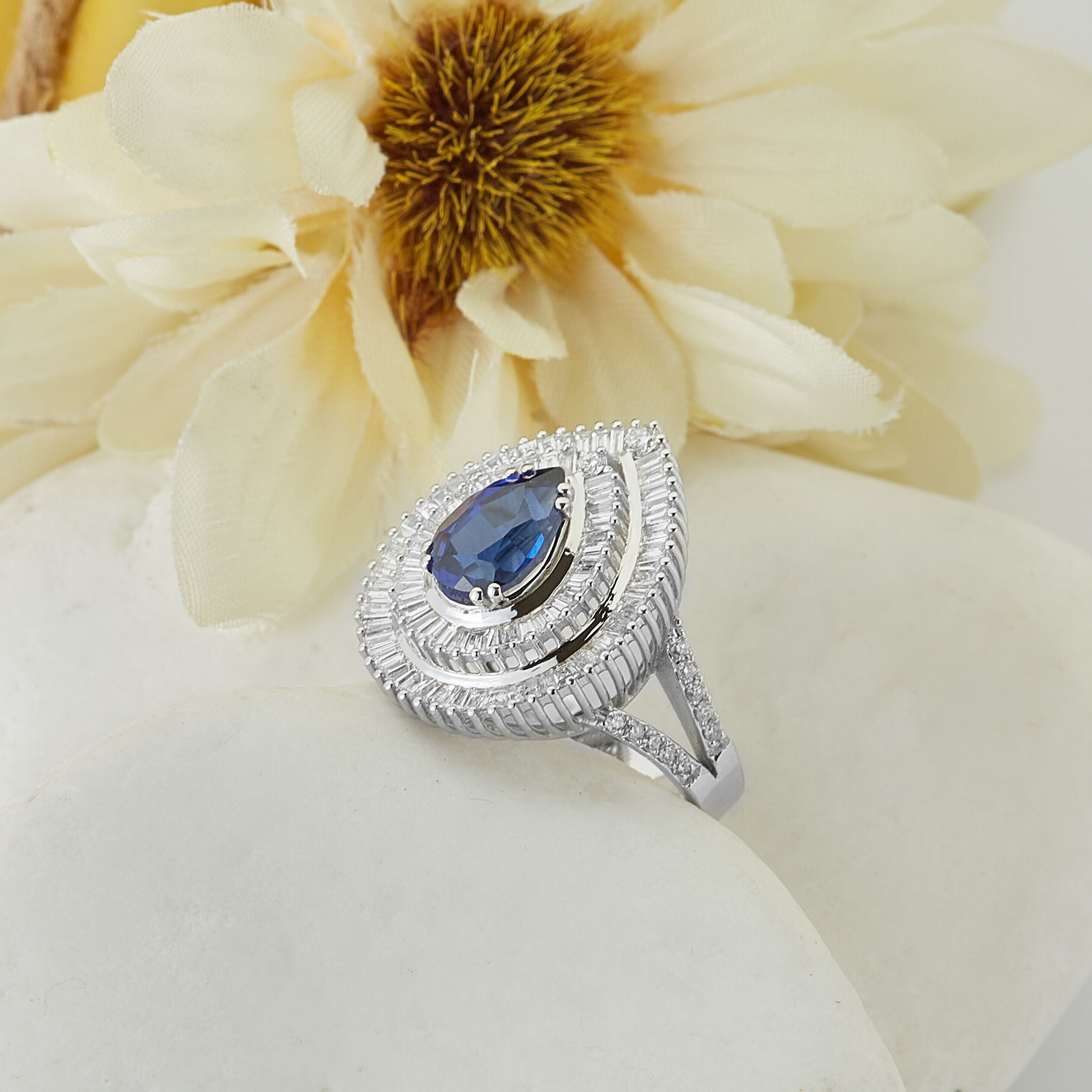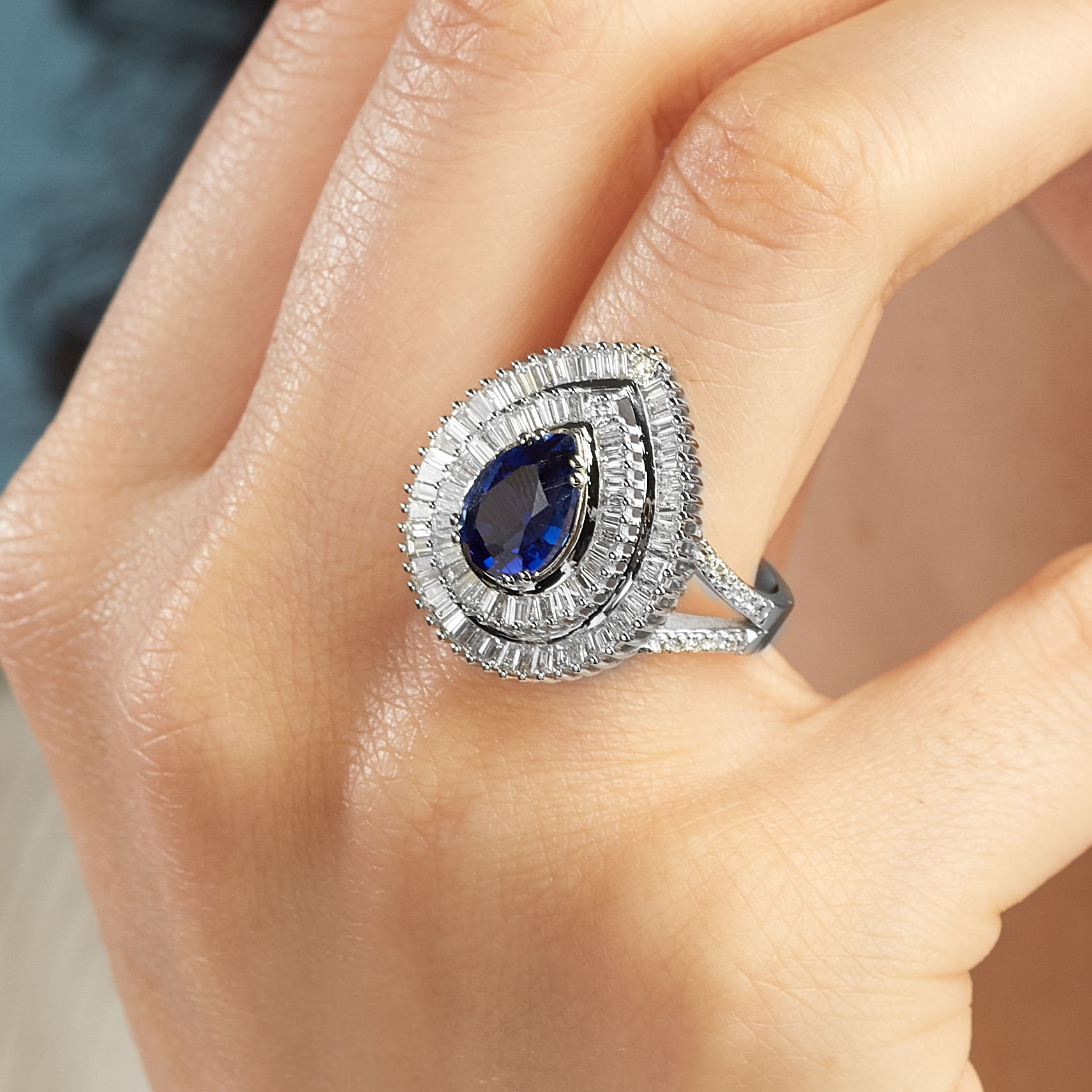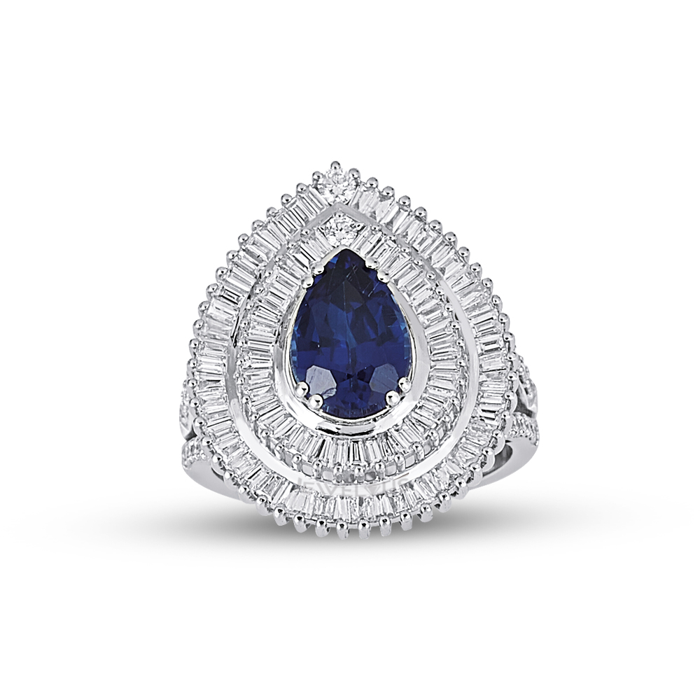 Exklusiver Klassiker dieser -MEINSCHMUCK- Weißgoldring mit Saphir und Diamanten. Der Ring ist aus 585er Weißgold gefertigt und der Ringkopf wird von einem Saphir (ca. 2,77 ct.) im Pearschliff und mehreren Diamanten (ca. 1,37 ct.gesamt) im Baguette- und Brillantschliff geziert. Der Brillantbesatz setzt sich auf der Ringschiene fort. Er passt zu zahlreichen Stilrichtungen und zu besonderen Veranstaltungen – Sie werden begeistert sein. Dieser wunderschöne Brillantring eignet sich auch wunderbar als Antragsring!
