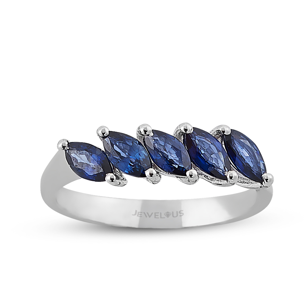 Ein mehrfarbiger – MEINSCHMUCK- Diamantring in zeitlosem Design aus 585er Weißgold, geziert mit fünf wundervollen Saphiren im Marquise Schliff schräg gefasst. Der Goldring strahlt unaufgeregte Eleganz aus mit seiner schmalen Ringschiene. Genauso schön wie die Ringschiene gearbeitet, sind auch die Saphire ( ca. 1,44ct. ), diese sind schräg angeordnet. Er passt zu zahlreichen Stilrichtungen und zu besonderen Veranstaltungen – Sie werden begeistert sein.