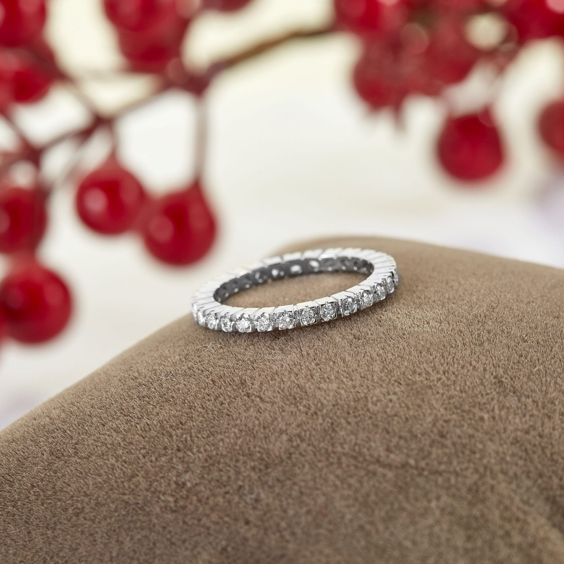 Atemberaubender Glanz weist dieser -MEINSCHMUCK- Memory Ring / Eternityring Ring aus 585er Gold auf. Auf der Ringschiene dieses Rings aus 585er Weißgold versammeln sich rundum Zirkoniasteinen. Die Zirkoniasteine verfügen über einen magischen Glanz, dem sich niemand entziehen kann. Insbesondere bei Lichteinfall entstehen atemberaubende Reflexionen. Das Gold ist auf Hochglanz poliert, was seinen Schimmer noch mehr zum Vorschein bringt. Ein derartiger Ring, dessen Ringschiene rundum mit Ziersteinen besetzt ist, wird auch als Eternityring (dt. Ewigkeitsring) oder Memoirering (dt. Erinnerungsring) bezeichnet. Er ist ein Symbol unvergesslicher Momente, denn jeder Stein kann für ein besonderes Ereignis stehen. Dieser wunderschöne Ring eignet sich wunderbar als Antragsring oder als Vorsteckring!