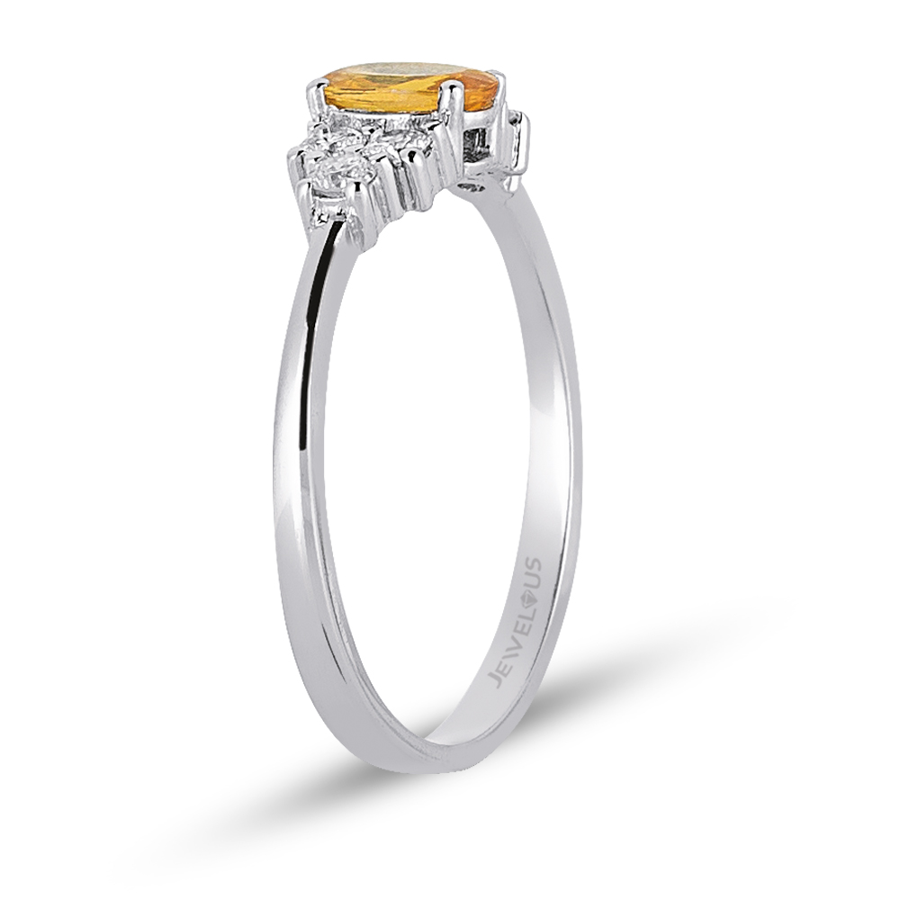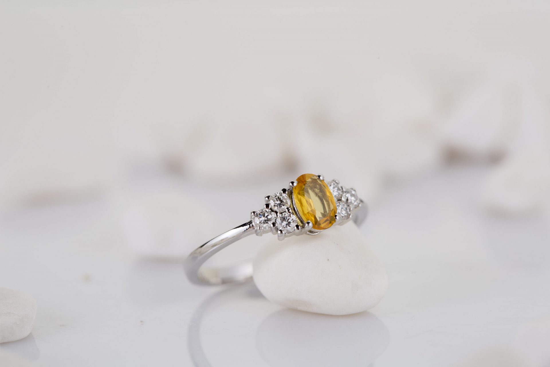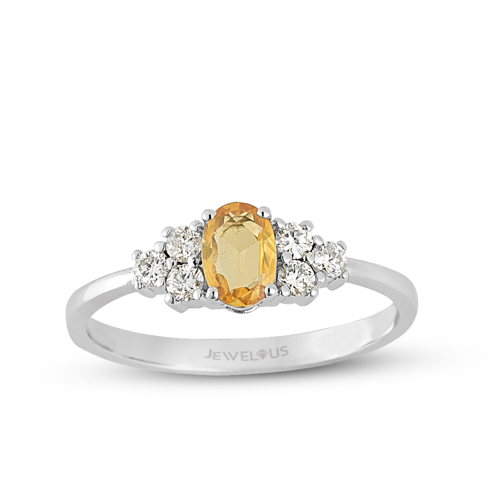 Voller Glanz dieser Damenring mit gelben Zirkoniastein aus 585er Weißgold. Sechs klare Zirkoniasteine im Brillantschliff bringen den zentralen gelben Zirkoniastein in ovalem Schliff zusätzlich zum Strahlen. Diese schöne Kombination macht aus dem filigranen Ring ein optisch abwechslungsreiches Schmuckstück, das zu zahlreichen Looks passen wird. Wir legen bei unserem Schmuck nur Wert auf eine exzellente Qualität. Die schmale Ringschiene gewährleistet ein angenehmes Tragegefühl. Dieser wunderschöne Ring eignet sich auch wunderbar als Antragsring oder als Geschenk!