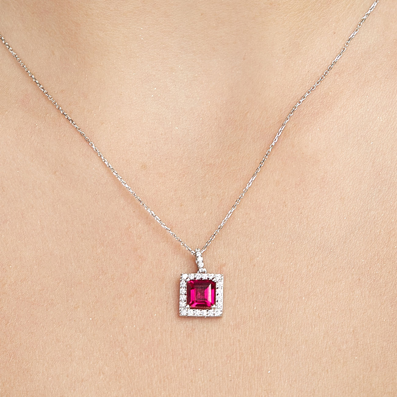 Goldkette mit Rubin in Princessschliff und umgeben von weiteren Brillanten aus 585er Weißgold