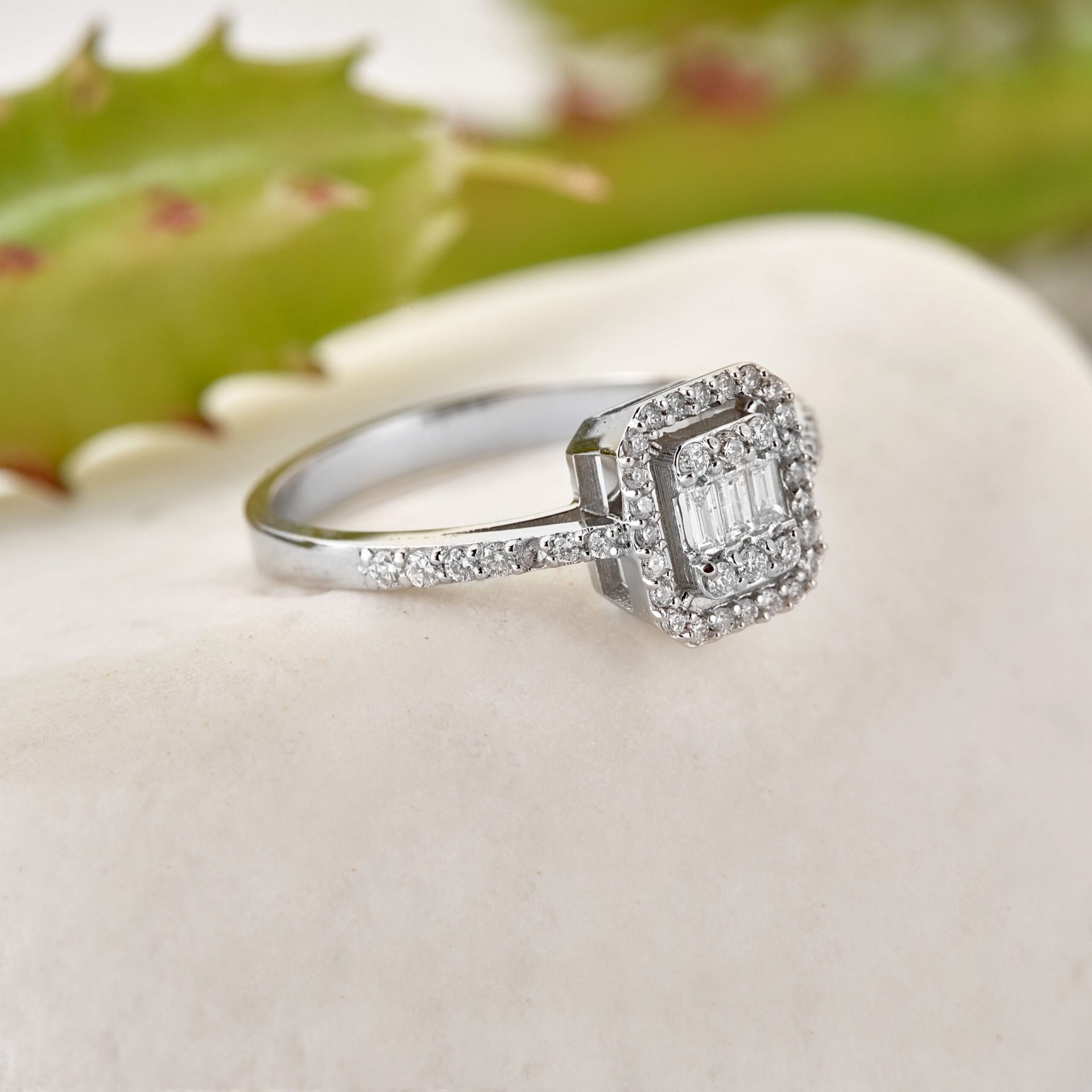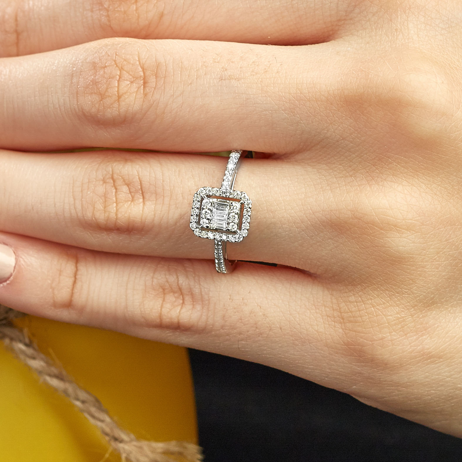 Ein funkelnder -MEINSCHMUCK- Goldring wird mit Zirkoniasteinen in Baguette- und Brillantschliff gekrönt. Gehalten werden die Zirkoniasteine von einer quadratischen Fassung mit abgerundeten Kanten. Der Zirkoniabesatz setzt sich auf der 585er Weißgold Ringschiene fort. Die schmale Ringschiene gewährleistet ein angenehmes Tragegefühl – Sie werden begeistert sein! Dieser wunderschöne Ring eignet sich auch wunderbar als Antragsring!