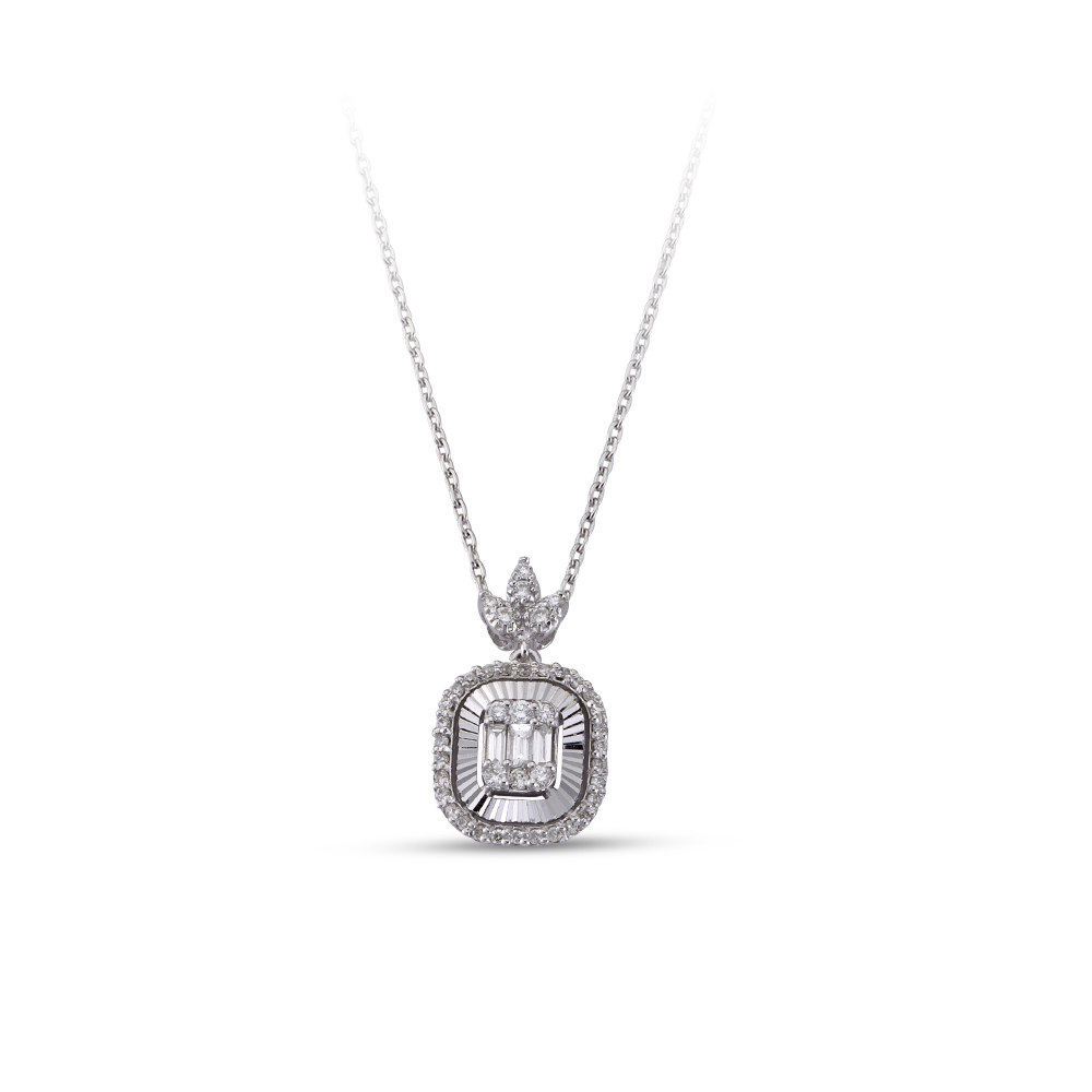 Funkelnde Eyecatcher – diese MEINSCHMUCK Kette mit Anhänger welcher mit weißen Brillanten im Baguette- und Brillantschliff geziert ist. Der quadratische Anhänger ist auf seiner Vorderseite vollkommen mit strahlenden Brillanten (gesamt ca. 0,35ct.) besetzt, die unablässig funkeln. Im Zentrum leuchten größere Brillanten im Baguetteschliff. Eine tolle Kombination aus 585er Weißgold und exclusiven Brillantbesatz. Diese Kette lässt sich vielseitig kombinieren, egal ob zu besonderen Anlässen oder ganz leger im Alltag! Machen Sie sich selbst eine Freude, mit dieser wunderschönen Kette! Kleiner Tipp – in unserem Shop erhalten Sie auch die passenden Ohrringe!