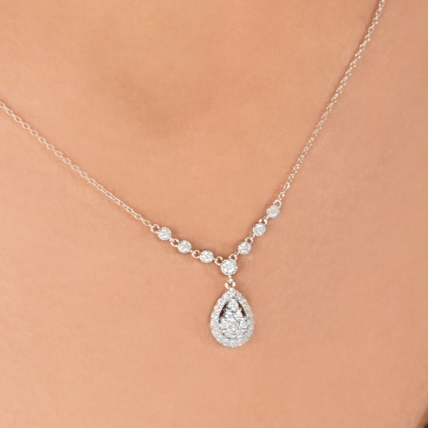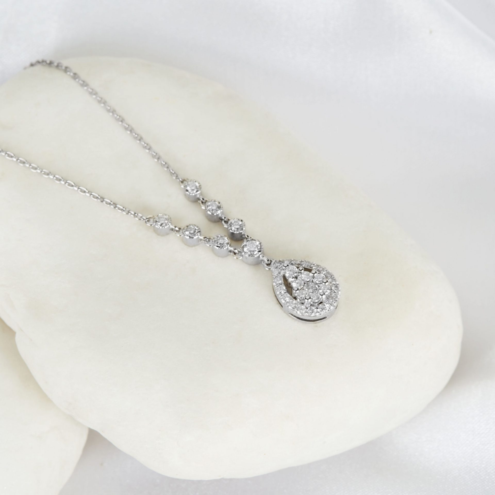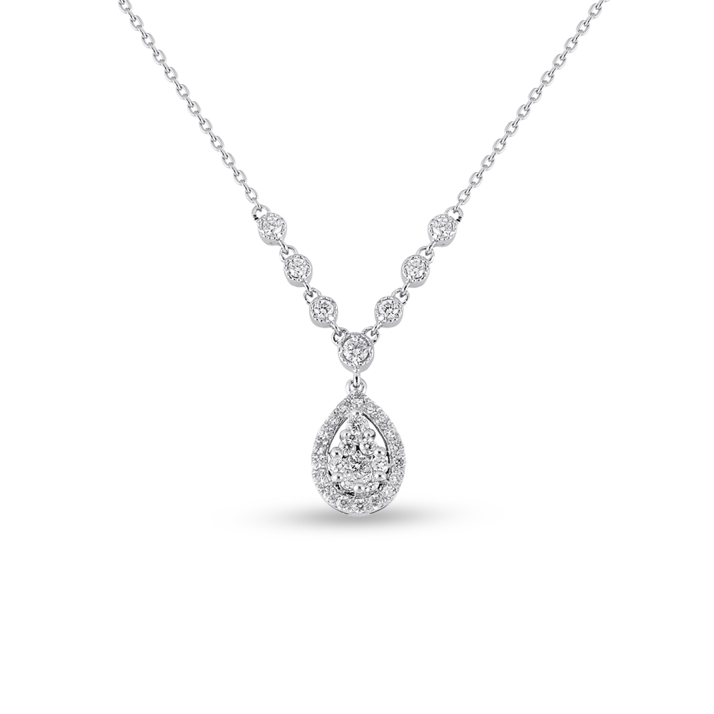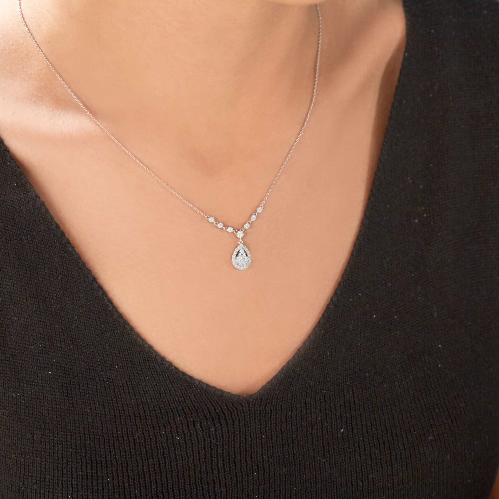Funkelnde Eyecatcher – diese MEINSCHMUCK Kette mit Anhänger welcher mit weißen Brillanten im Baguette- und Brillantschliff geziert ist. Der tropfenförmige Anhänger ist auf seiner Vorderseite vollkommen mit strahlenden Brillanten (gesamt ca. 0,47ct.) besetzt, die unablässig funkeln. Im Zentrum leuchten größere Brillanten im Baguetteschliff. Eine tolle Kombination aus 585er Weißgold und exclusiven Brillantbesatz. Diese Kette lässt sich vielseitig kombinieren, egal ob zu besonderen Anlässen oder ganz leger im Alltag! Machen Sie sich selbst eine Freude, mit dieser wunderschönen Kette! Kleiner Tipp – in unserem Shop erhalten Sie auch die passenden Ohrringe!