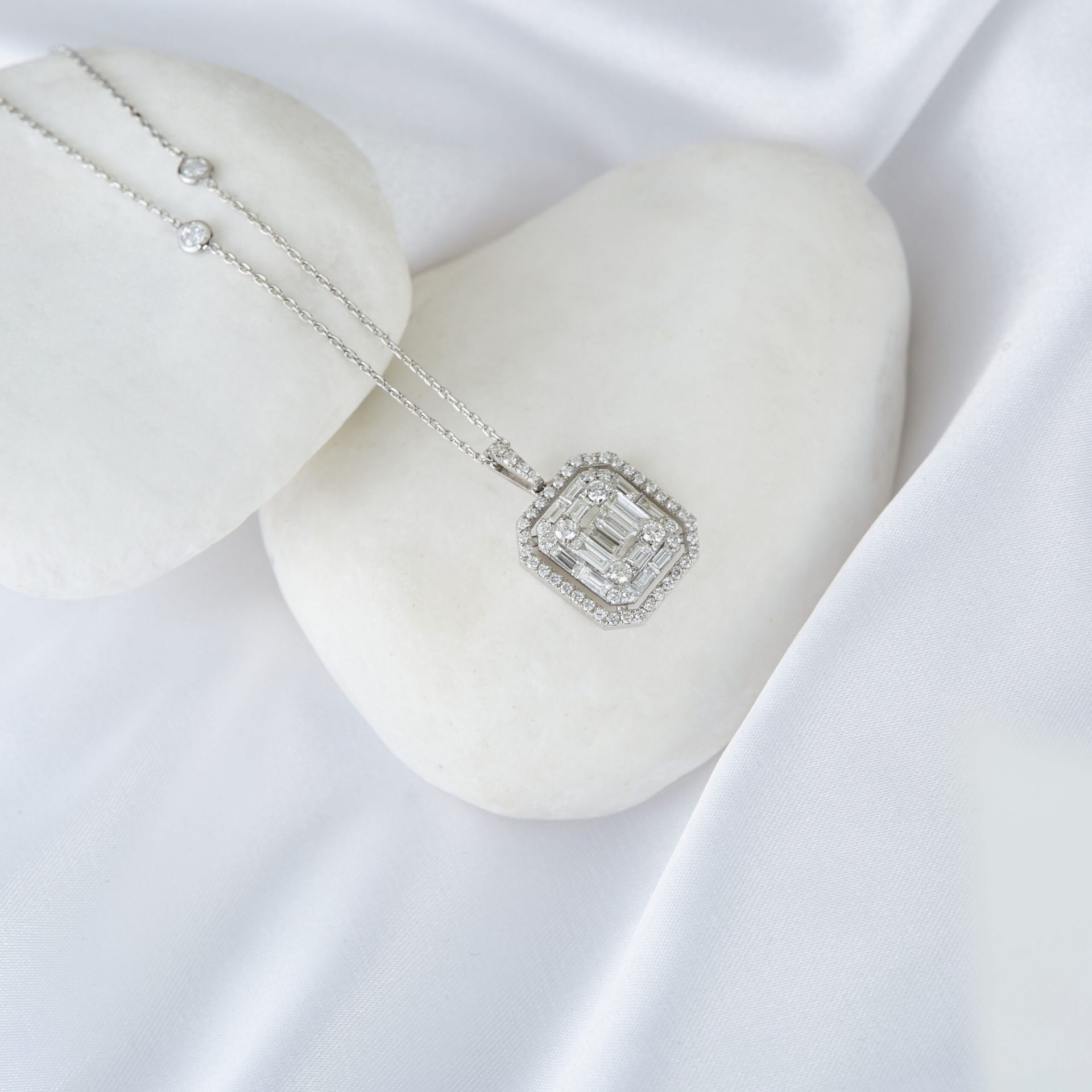 Hochkarätige Geschenkidee – Brillant besetzter Anhänger mit exklusivem Funkeln und filigraner Ankerkette! Mit dieser funkelnden MEINSCHMUCK Kette und vor allem ihrem quadratischem Anhänger aus rhodiniertem 585er Weißgold machen Sie alles richtig, ob zum Verschenken oder um sich selbst eine Freude zu bereiten. Der quadratische Anhänger besticht ganz und gar durch die reinweißen Diamanten (ca. 1,42ct.) im Baguette- und Brillantschliff. Das rhodinierte 585er Weißgold, welches die Basis des Anhängers bildet und aus dem auch die Kette gefertigt ist, harmoniert perfekt mit dem Funkeln der Brillanten.