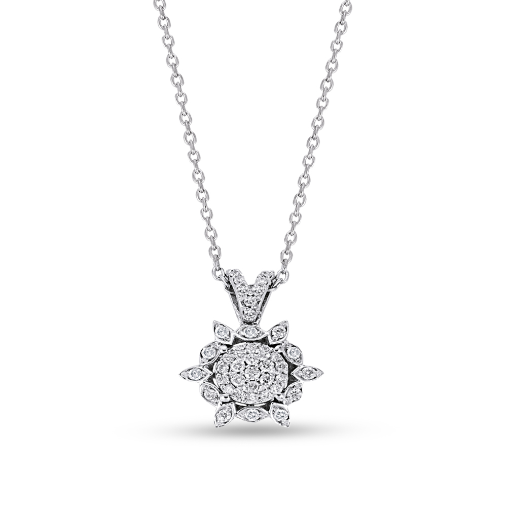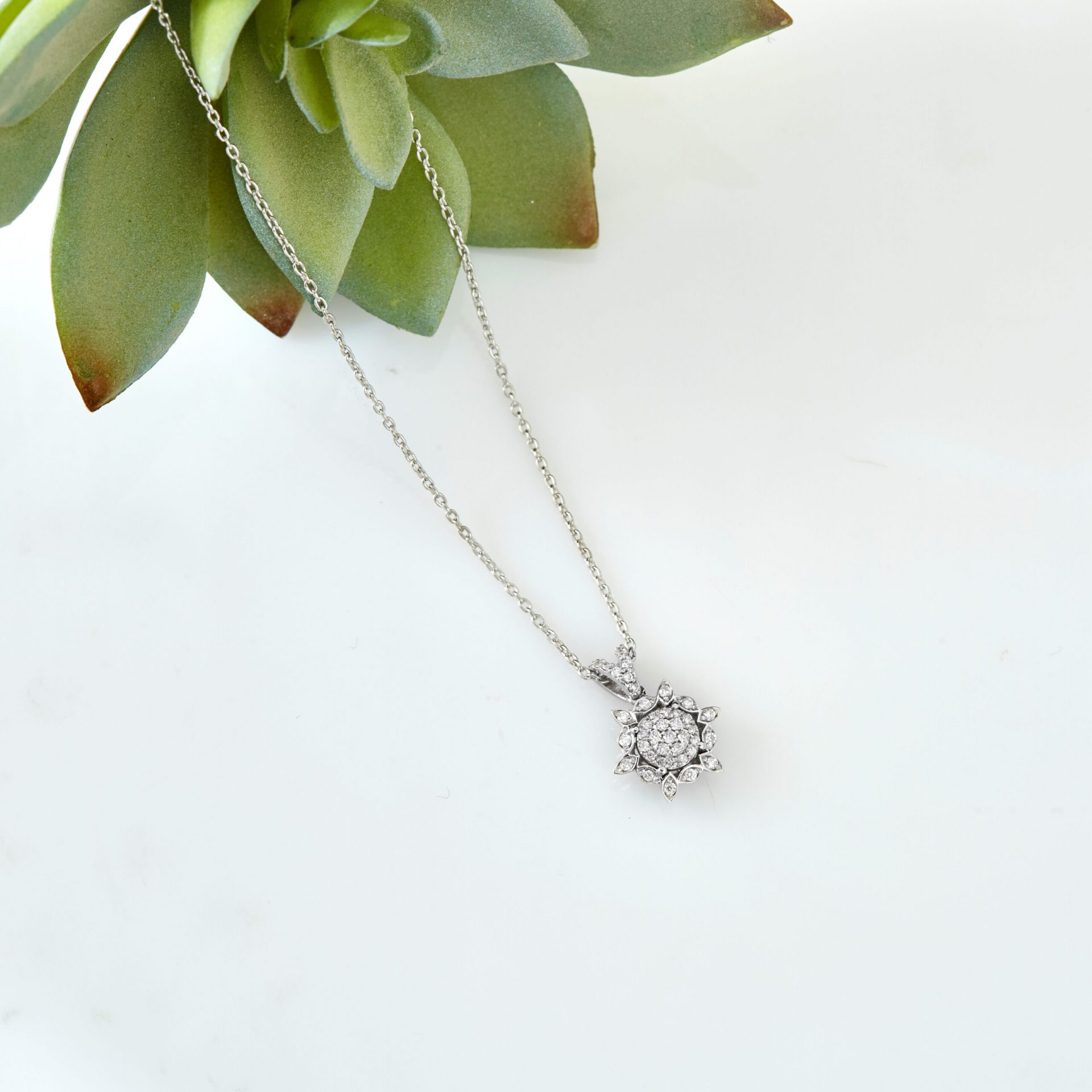 Zum Verlieben schön – florale MEINSCHMUCK Halskette aus 585er Weißgold mit Brillanten. Diese Kette aus 585er Gold ist ein absolut bezaubernder Eyecatcher! Der Anhänger in moderner Blumenform wird geziert von weiß funkelnden Brillanten (ca. 0,23ct.). Die feingliedrige Ankerkette garantiert einen angenehmen Tragekomfort. Diese Kette lässt sich vielseitig kombinieren, egal ob zu besonderen Anlässen oder ganz leger im Alltag! Machen Sie sich selbst eine Freude, mit dieser wunderschönen Kette! Kleiner Tipp – in unserem Shop erhalten Sie auch die passenden Ohrringe!