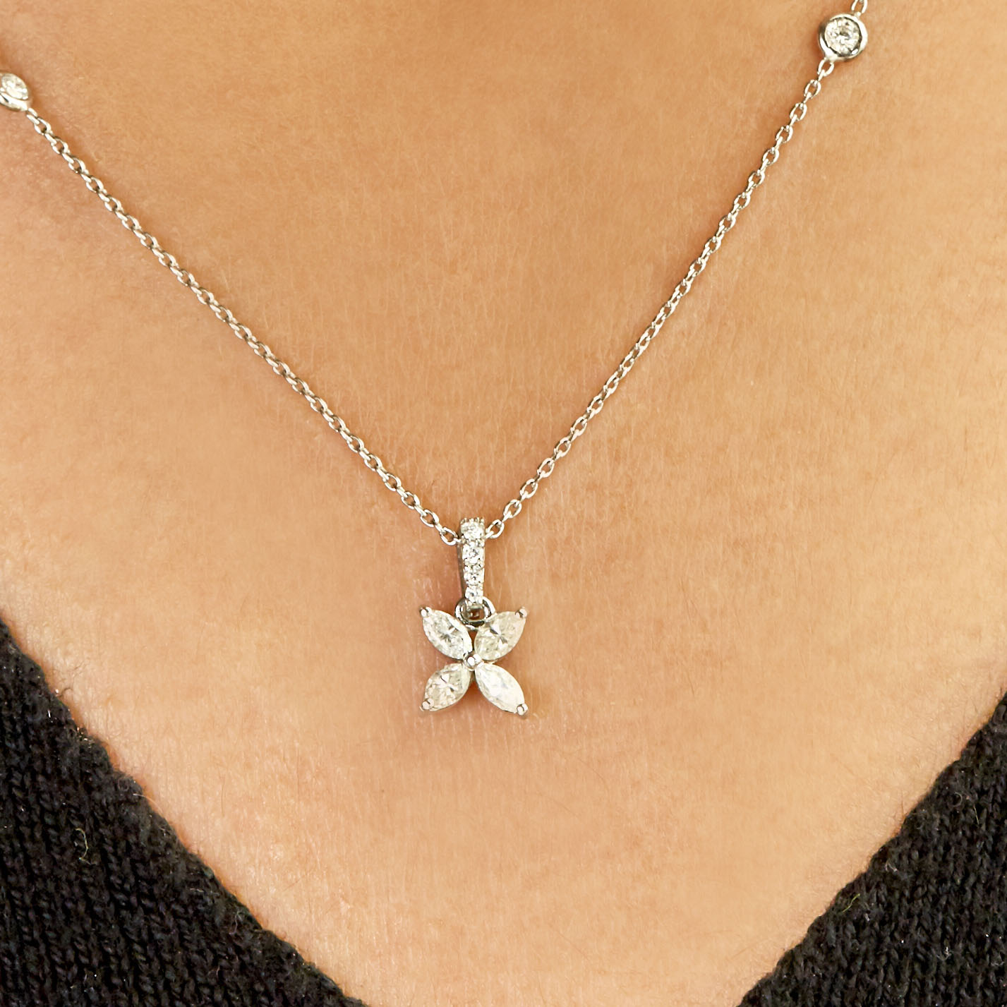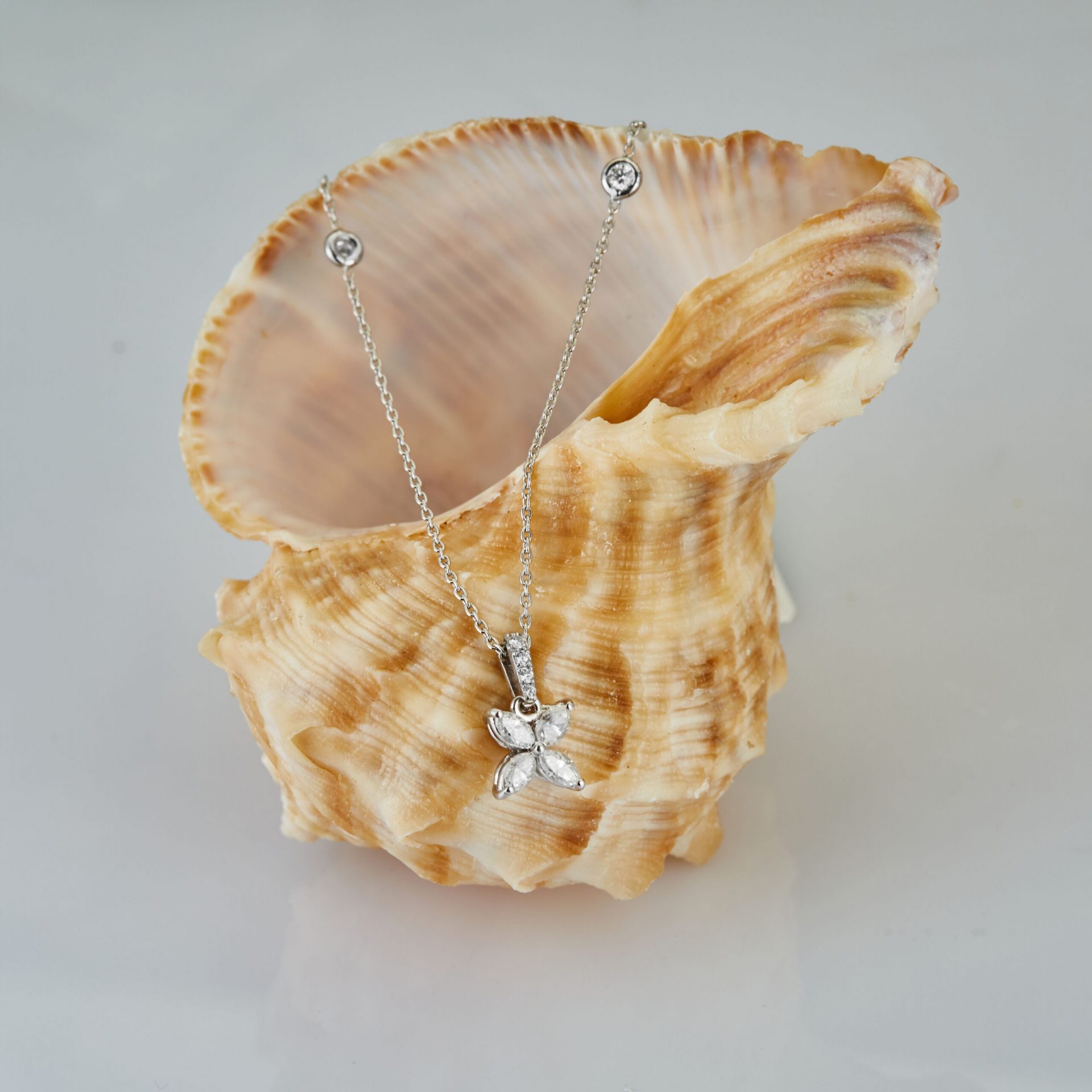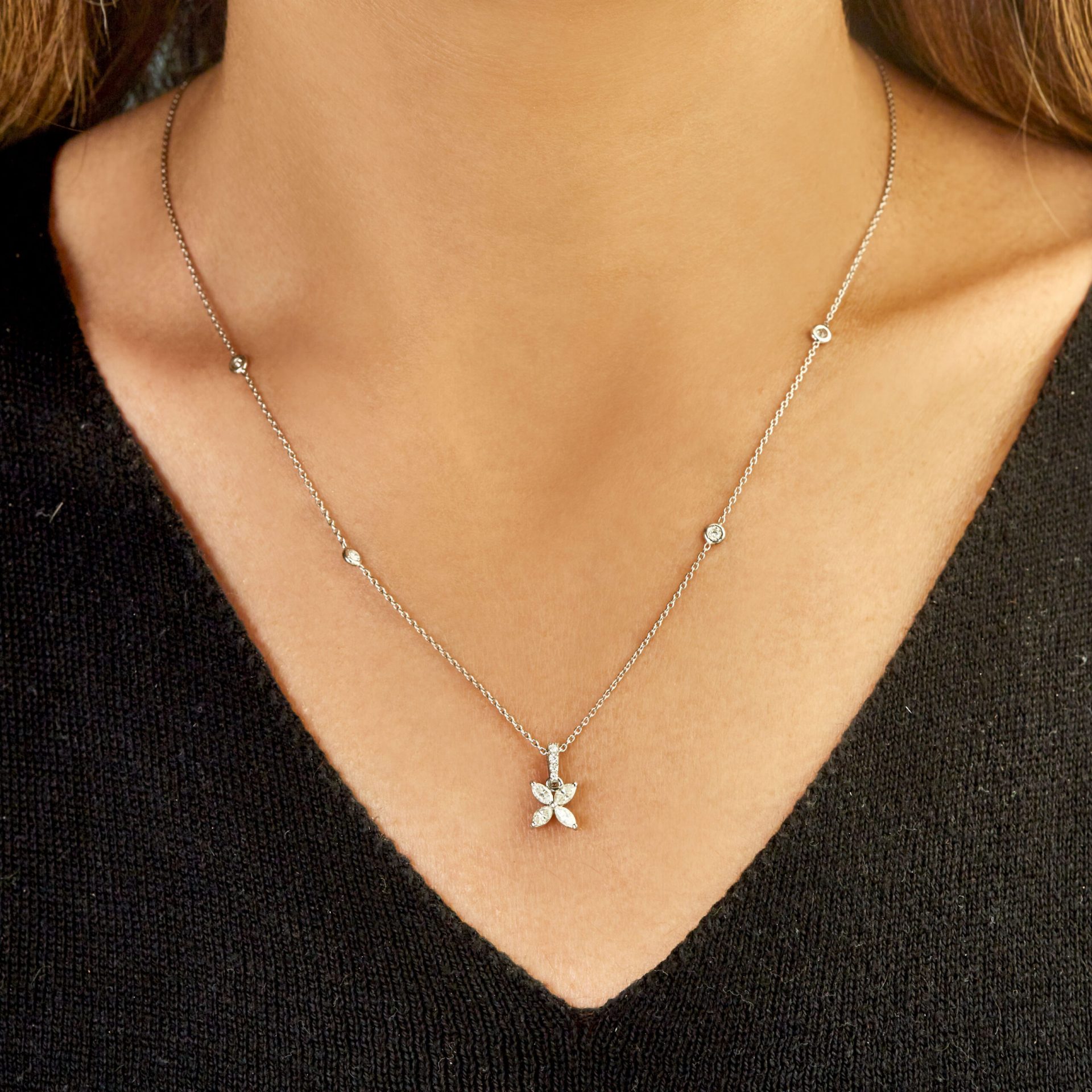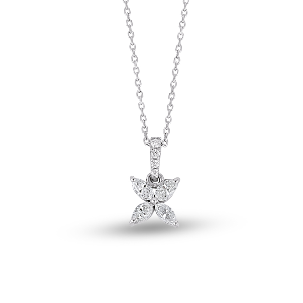 Zum Verlieben schön – florale MEINSCHMUCK Halskette aus 585er Weißgold mit Brillanten. Diese Kette aus 585er Gold ist ein absolut bezaubernder Eyecatcher! Der Anhänger in moderner Blumenform wird geziert von weiß funkelnden Brillanten (ca. 0,64ct.). Die feingliedrige Ankerkette garantiert einen angenehmen Tragekomfort. Diese Kette lässt sich vielseitig kombinieren, egal ob zu besonderen Anlässen oder ganz leger im Alltag! Machen Sie sich selbst eine Freude, mit dieser wunderschönen Kette! Kleiner Tipp – in unserem Shop erhalten Sie auch die passenden Ohrringe!