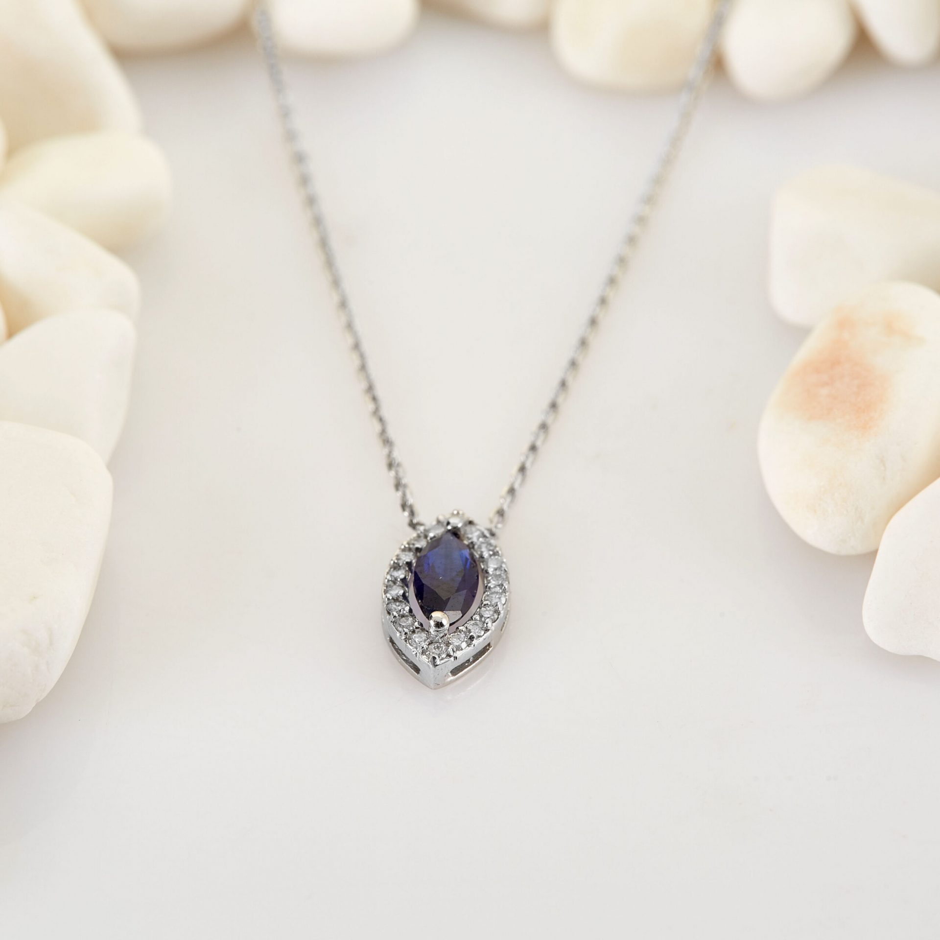 Feligrane Kette mit Saphir – der Saphir (ca. 0,28ct.) in Marquiseschliff wird zum Eyecatcher dieser MEINSCHMUCK Kette. Der Saphir ist nicht der einzige Steinbesatz der filigranen Ankerkette, sonderen ist von Brillanten (ca. 0,08ct.) umgeben! Mit dieser bezaubernden MEINSCHMUCK Kette und vor allem ihrem Anhänger aus rhodiniertem 585er Weißgold machen Sie alles richtig, ob zum Verschenken oder um sich selbst eine Freude zu bereiten.