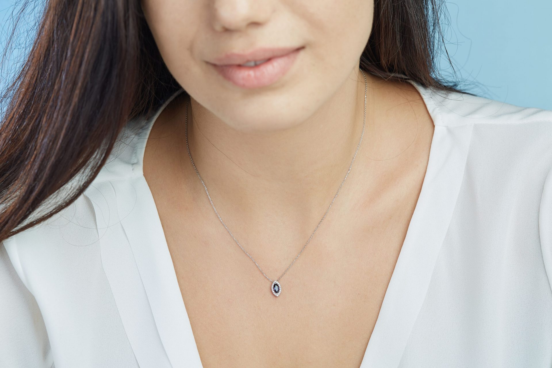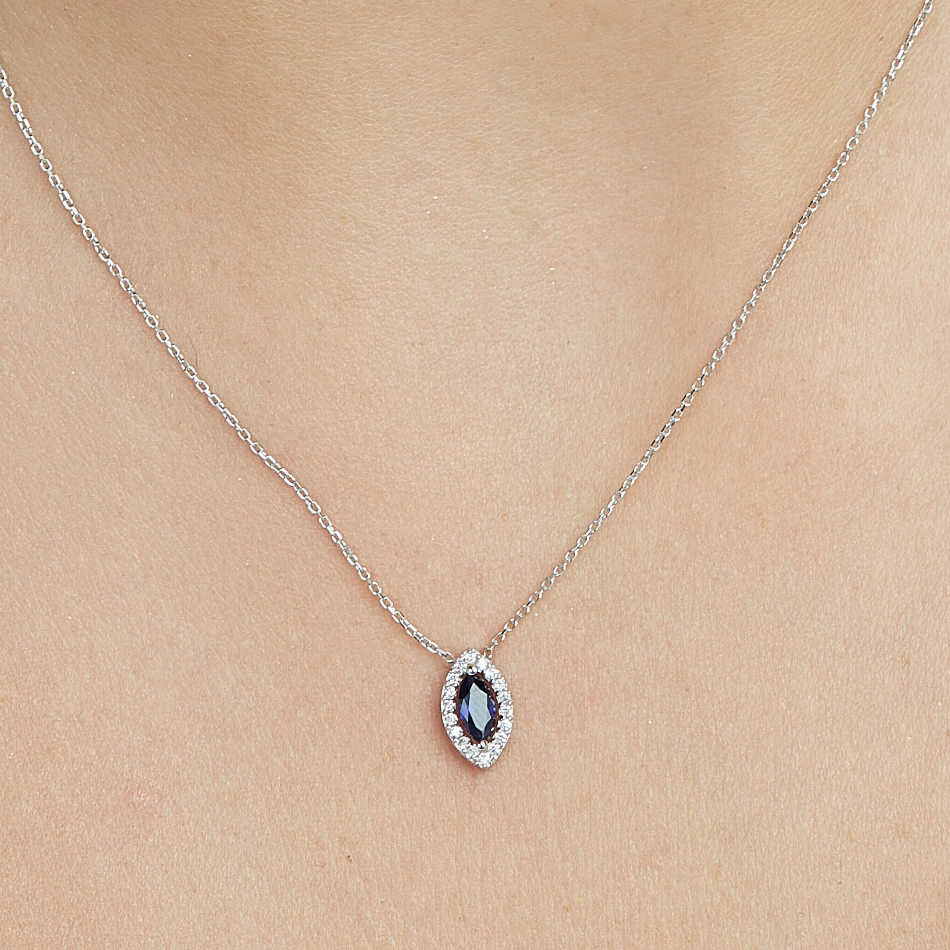 Feligrane Kette mit Saphir – der Saphir (ca. 0,87ct.) in Marquiseschliff wird zum Eyecatcher dieser MEINSCHMUCK Kette. Der Saphir ist nicht der einzige Steinbesatz der filigranen Ankerkette, sonderen ist von Brillanten (ca. 0,17ct.) umgeben! Mit dieser bezaubernden MEINSCHMUCK Kette und vor allem ihrem Anhänger aus rhodiniertem 585er Weißgold machen Sie alles richtig, ob zum Verschenken oder um sich selbst eine Freude zu bereiten.