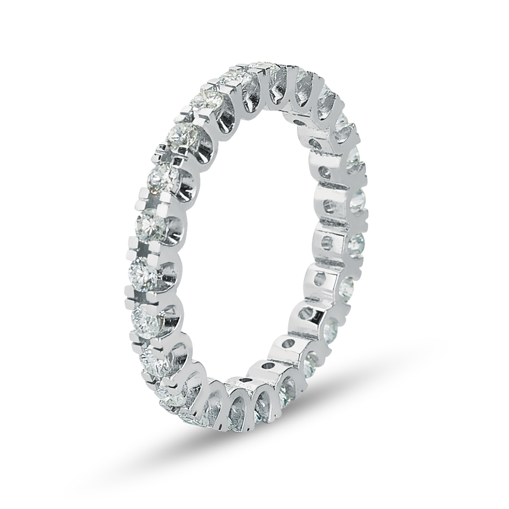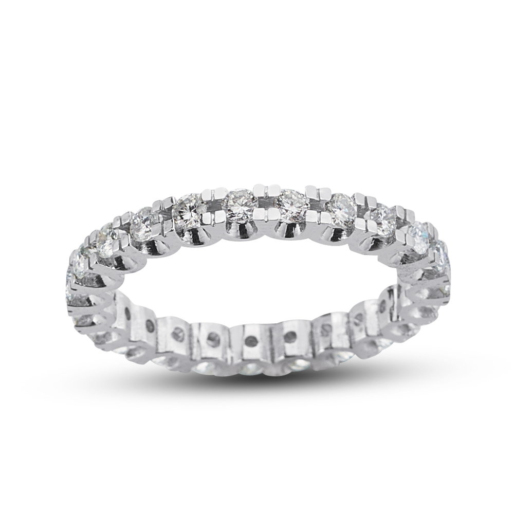 Atemberaubender Glanz weist dieser -MEINSCHMUCK- Memory Ring / Eternityring / Diamant Ring aus 585er Gold auf. Auf der Ringschiene dieses Rings aus 585er Weißgold versammeln sich rundum Diamanten mit ca. 0,91ct. (gesamt). Die Diamanten verfügen über einen magischen Glanz, dem sich niemand entziehen kann. Insbesondere bei Lichteinfall entstehen atemberaubende Reflexionen. Je mehr Karat ein Diamant besitzt, desto größer ist sein Seltenheitswert und desto wertvoller ist er somit auch. Das Gold ist auf Hochglanz poliert, was seinen Schimmer noch mehr zum Vorschein bringt. Ein derartiger Ring, dessen Ringschiene rundum mit Diamanten oder anderen Ziersteinen besetzt ist, wird auch als Eternityring (dt. Ewigkeitsring) oder Memoirering (dt. Erinnerungsring) bezeichnet. Er ist ein Symbol unvergesslicher Momente, denn jeder Diamant kann für ein besonderes Ereignis stehen. Dieser wunderschöne Ring eignet sich wunderbar als Antragsring oder als Vorsteckring!