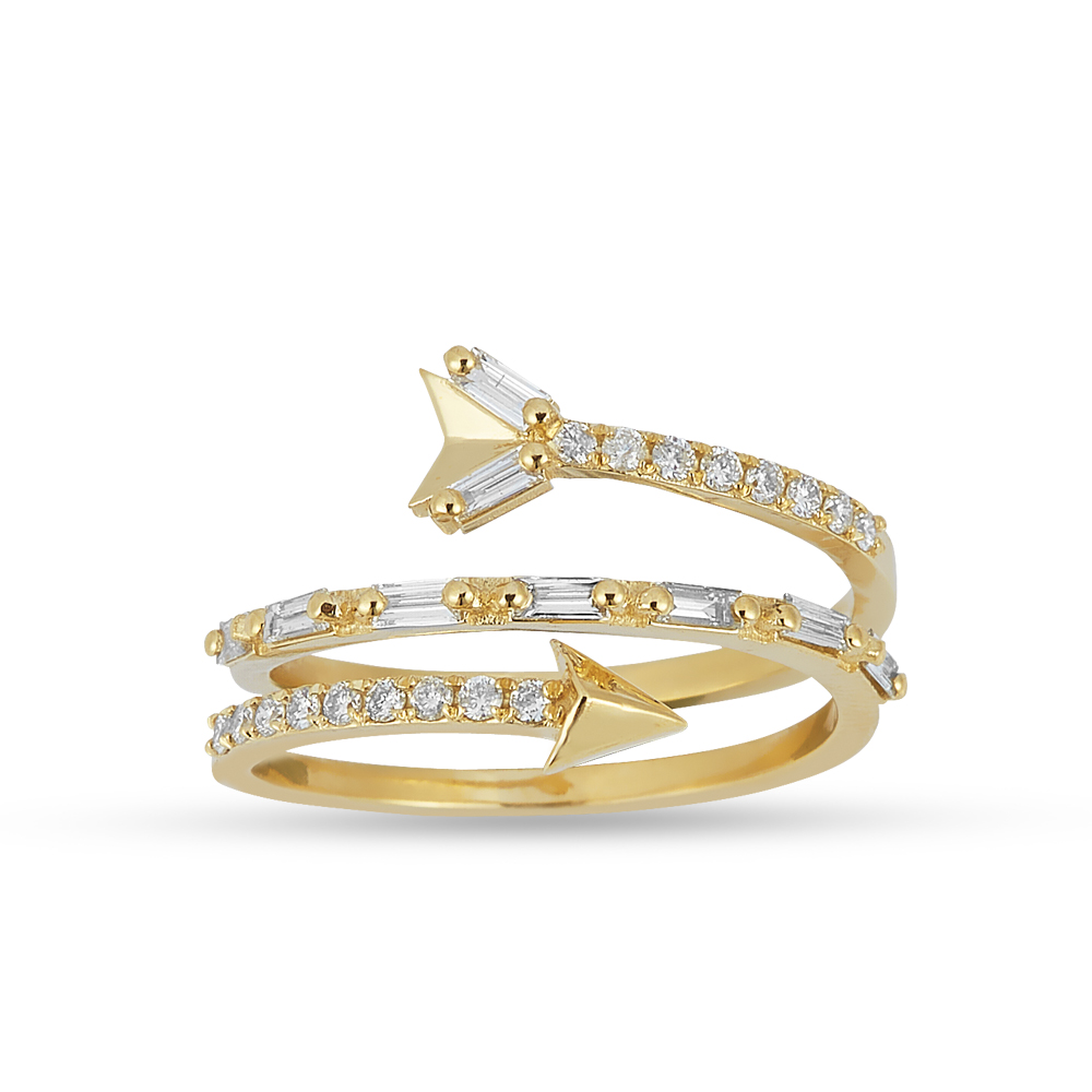 Dieser MEINSCHMUCK Pfeil-Ring / Zirkonia Ring aus 585er Gold trifft genau ins Schwarze mit seiner Kombination aus Zirkoniasteine im Brillant- und Baguetteschliff. Auf der geteilten Ringschiene dieses Rings aus 585er Gelbgold versammeln sich die funkelnden Zirkoniasteine in Pfeil-Form. Die Zirkoniasteine verfügen über einen magischen Glanz, dem sich niemand entziehen kann. Insbesondere bei Lichteinfall entstehen atemberaubende Reflexionen. Das Gold ist auf Hochglanz poliert, was seinen Schimmer noch mehr zum Vorschein bringt. Dieser wunderschöne Ring eignet sich wunderbar als Antragsring oder als Vorsteckring! Dieser Goldring ist in den Farben Gelbgold, Weißgold und Rotgold erhältlich.
