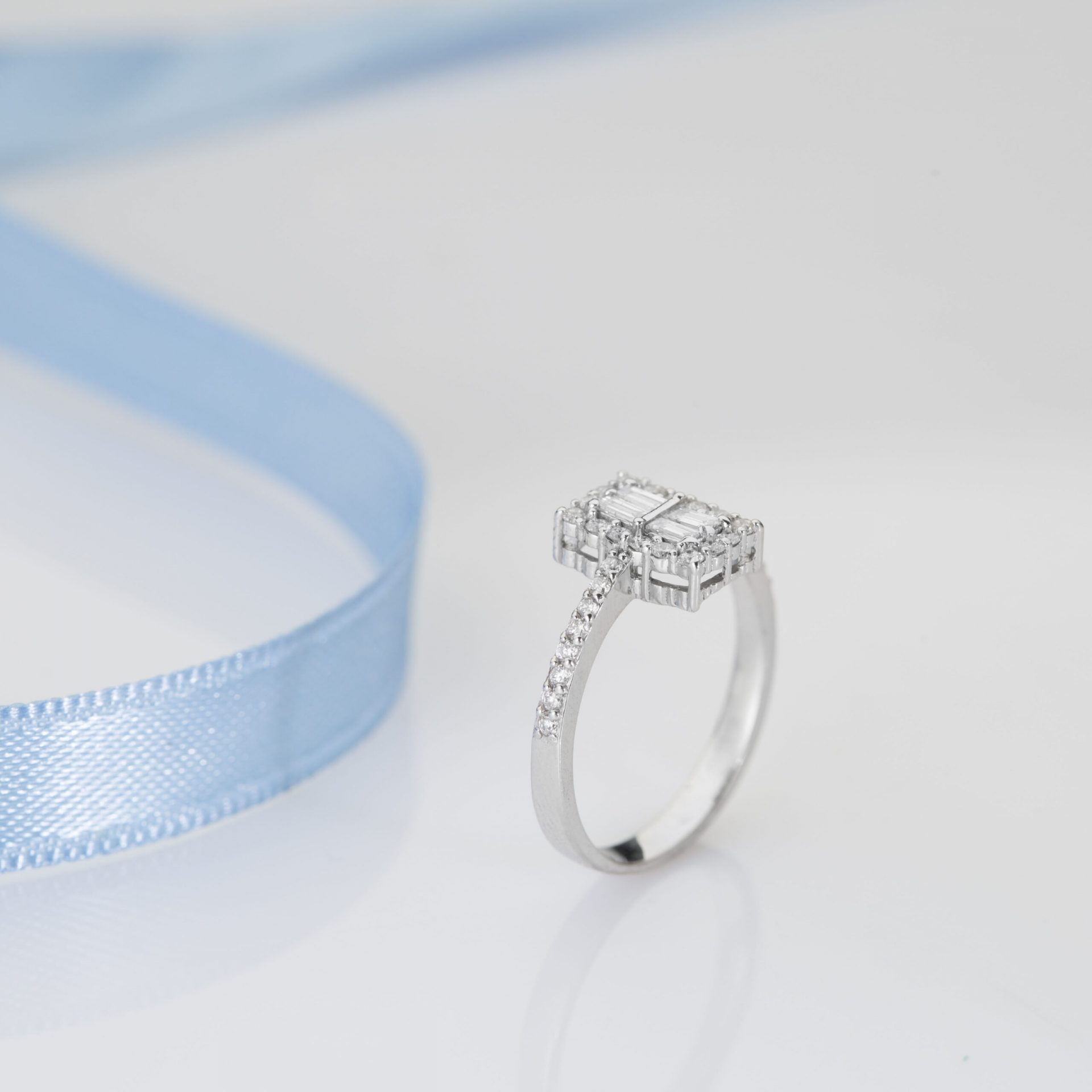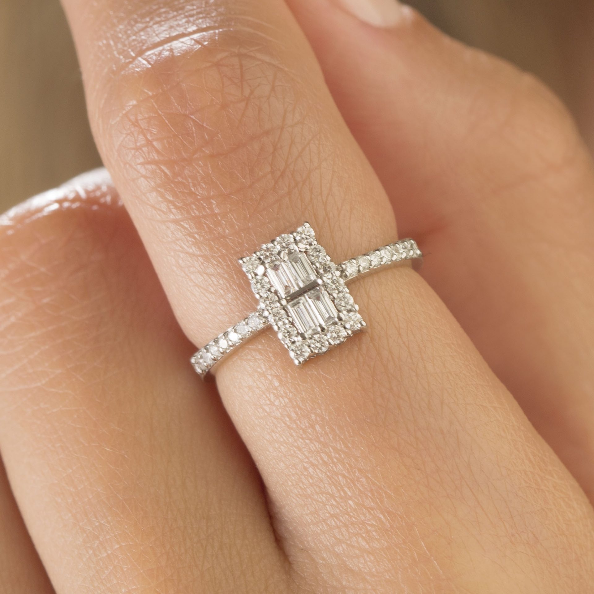 Ein wunderschön funkelnder -MEINSCHMUCK- Diamantring / Verlobungsring aus 585er Gold. Der Ring wird von Brillanten in Baguette- und Brillantschliff gekrönt. Gehalten werden die Steine von einer rechteckigen Fassung mit abgerundeten Kanten. Die Fassung zieren Brillanten im Verschnitt gesetzt mit wundervollem Funkeln. Der funkelnde Brillantbesatz setzt sich auf der Ringschiene weiter fort. Die schmale Ringschiene gewährleistet ein angenehmes Tragegefühl. Er passt zu zahlreichen Stilrichtungen und zu besonderen Veranstaltungen – Sie werden begeistert sein! Insgesamt wird dieser Ring mit Brillanten ca. 0,43ct. geziert. Dieser wunderschöne Brillantring eignet sich auch wunderbar als Antragsring!