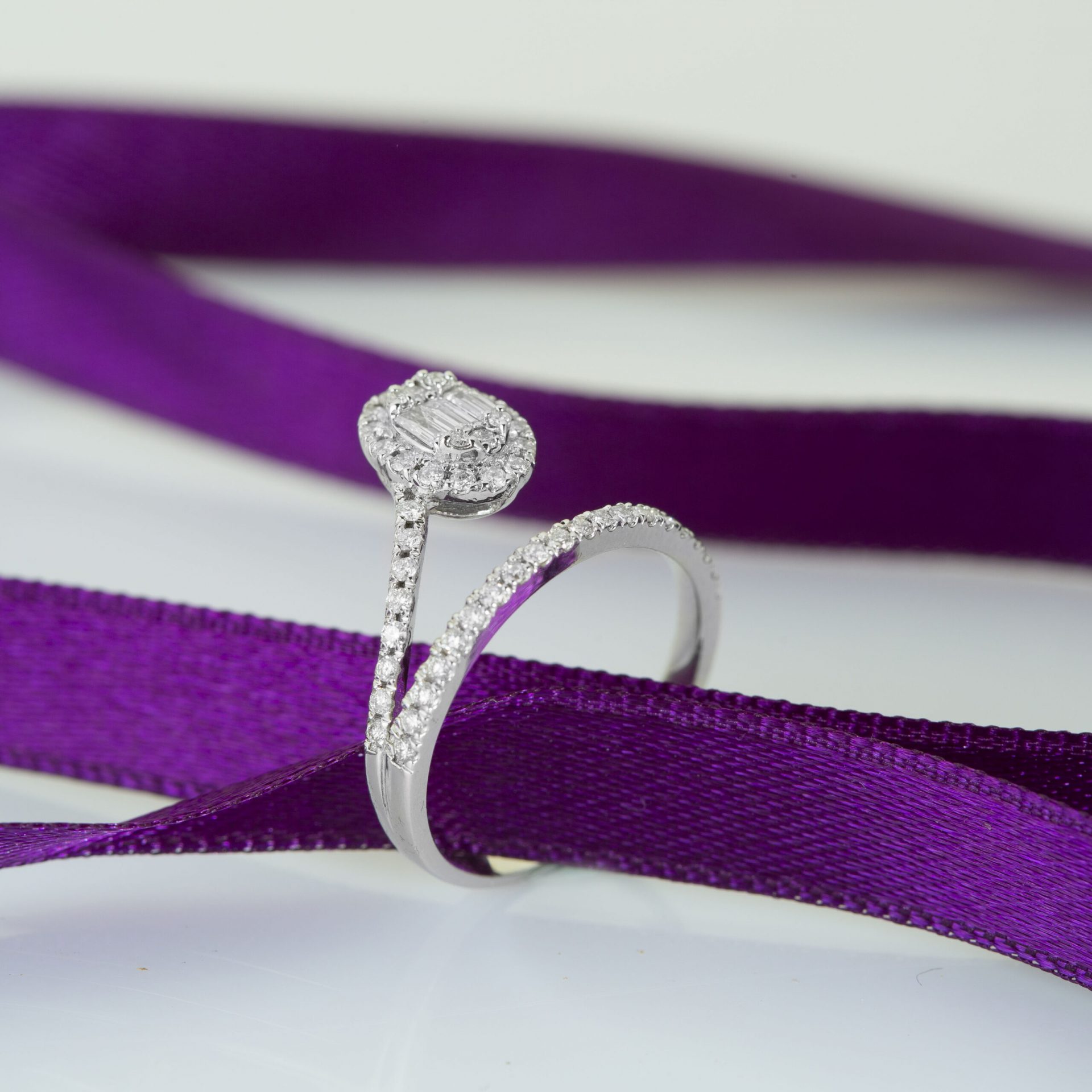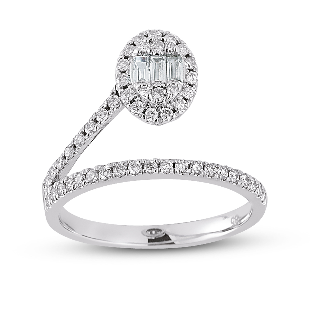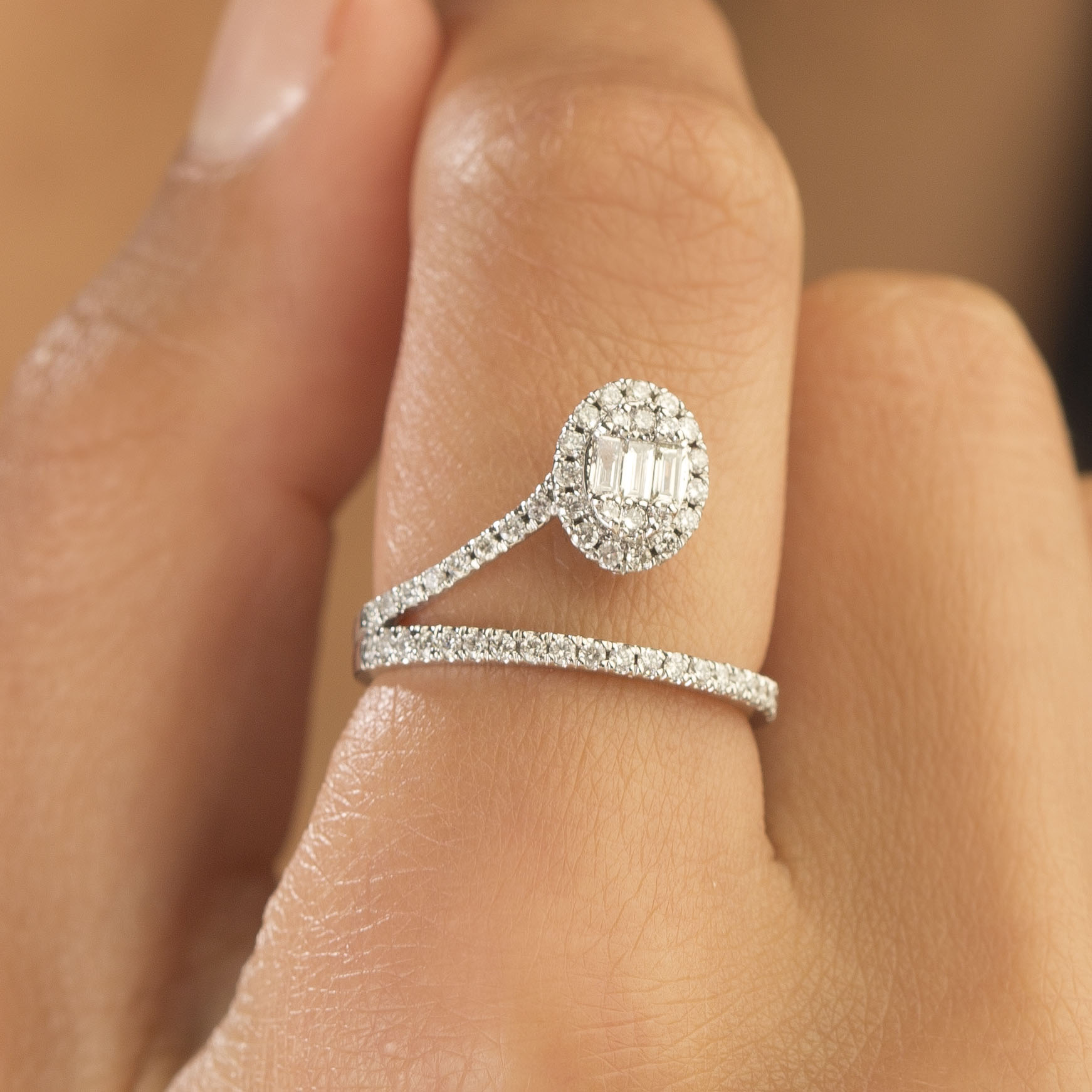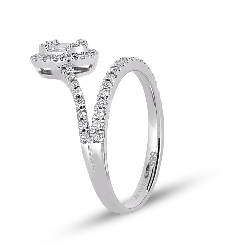 Ein absoluter Blickfang dieser feligrane Zirkoniaring aus elegantem 585er Weißgold. Das Schmuckstück wird von funkelnden Zirkoniasteinen in Brillant- und Baguetteschliff geziert. Der Ring hat ein außergewöhnliches Design, eine Art Zweig geht von der Ringschiene ab, welcher in einer ovalen Form endet und garantiert für einen Blickfang sorgt. Der funkelnde Steinbesatz ist im Halbkranz auf der Ringschiene gefasst. Der Allroundstar lässt sich toll mit anderen Kostbarkeiten kombinieren und eignet sich als Krönung für besondere Momente. Die schmale Ringschiene gewährleistet ein angenehmes Tragegefühl.