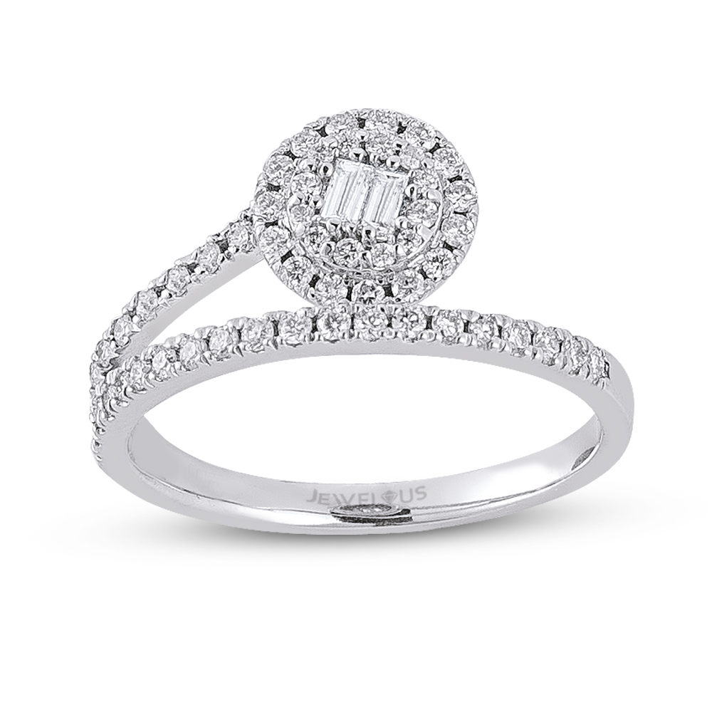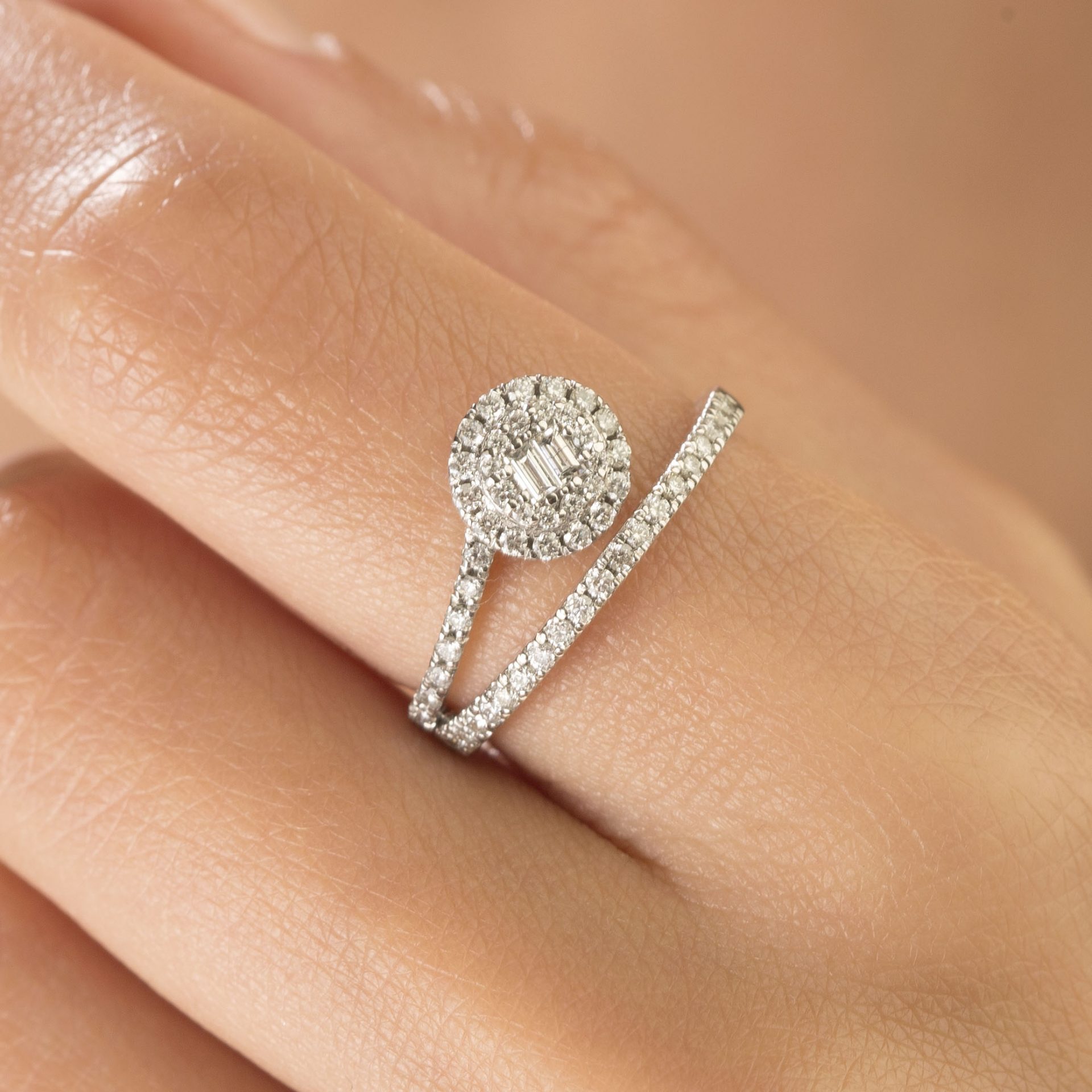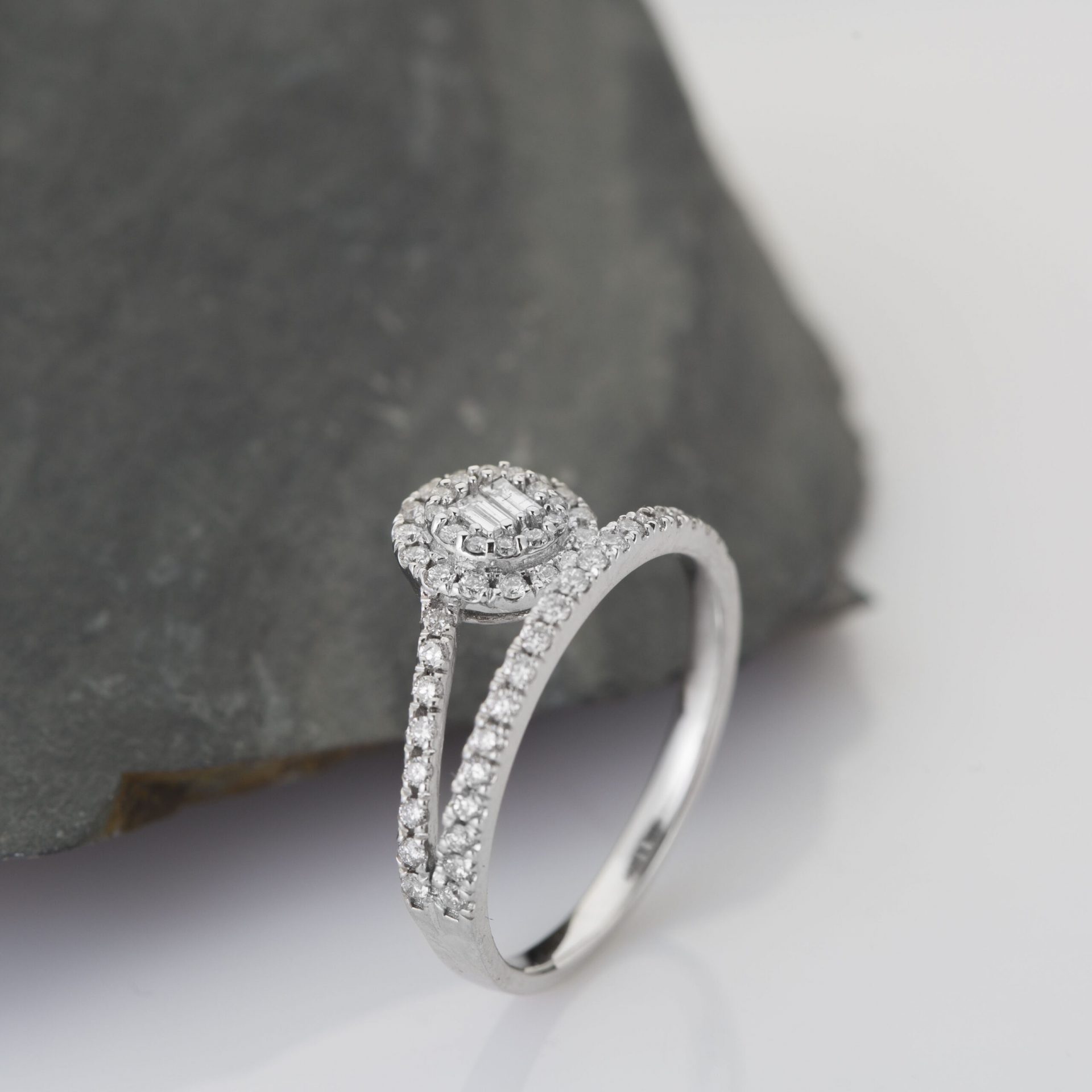 Ein absoluter Blickfang dieser feligrane Ring aus elegantem 585er Weißgold. Das Schmuckstück wird von funkelnden Zirkoniasteinen in Brillant- und Baguetteschliff geziert. Der Ring hat ein außergewöhnliches Design, eine Art Zweig geht von der Ringschiene ab, welcher in einer runden Form endet und garantiert für einen Blickfang sorgt. Der funkelnde Steinbesatz ist im Halbkranz auf der Ringschiene gefasst. Der Allroundstar lässt sich toll mit anderen Kostbarkeiten kombinieren und eignet sich als Krönung für besondere Momente. Die schmale Ringschiene gewährleistet ein angenehmes Tragegefühl. Dieser wunderschöne Ring eignet sich wunderbar als Geschenk oder Sie machen sich selbst eine Freude!