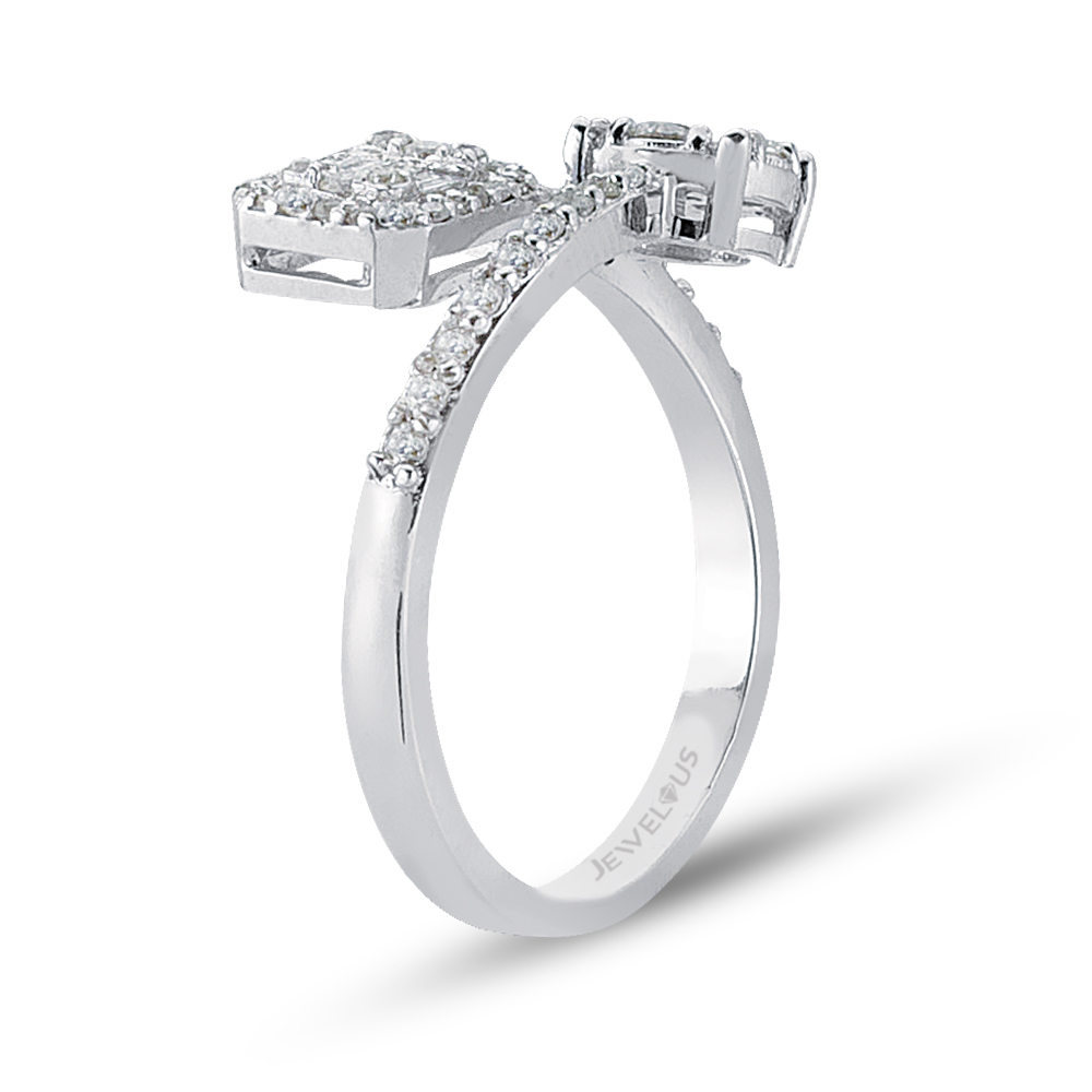 Edler Blickfang – dieser MEINSCHMUCK Diamantring mit offner Ringschiene und exklusivem Steinbesatz. Die offene zueinanderlaufende Ringschiene aus 585er Weißgold ist am Ende einem kreisrundem und quadratischen Zierelement geziert. Diese sind vollständig mit Brillanten (ca. 0,56ct.) im Brillant- und Baguetteschliff bestückt. Zudem wird etwa die Hälfte der Ringschiene von strahlend weißen Diamanten geziert. Die schmale Ringschiene gewährleistet ein angenehmes Tragegefühl. Dieser wunderschöne Brillantring eignet sich auch wunderbar als Antragsring!