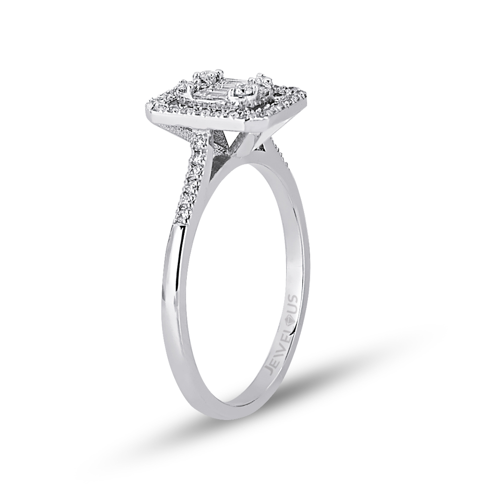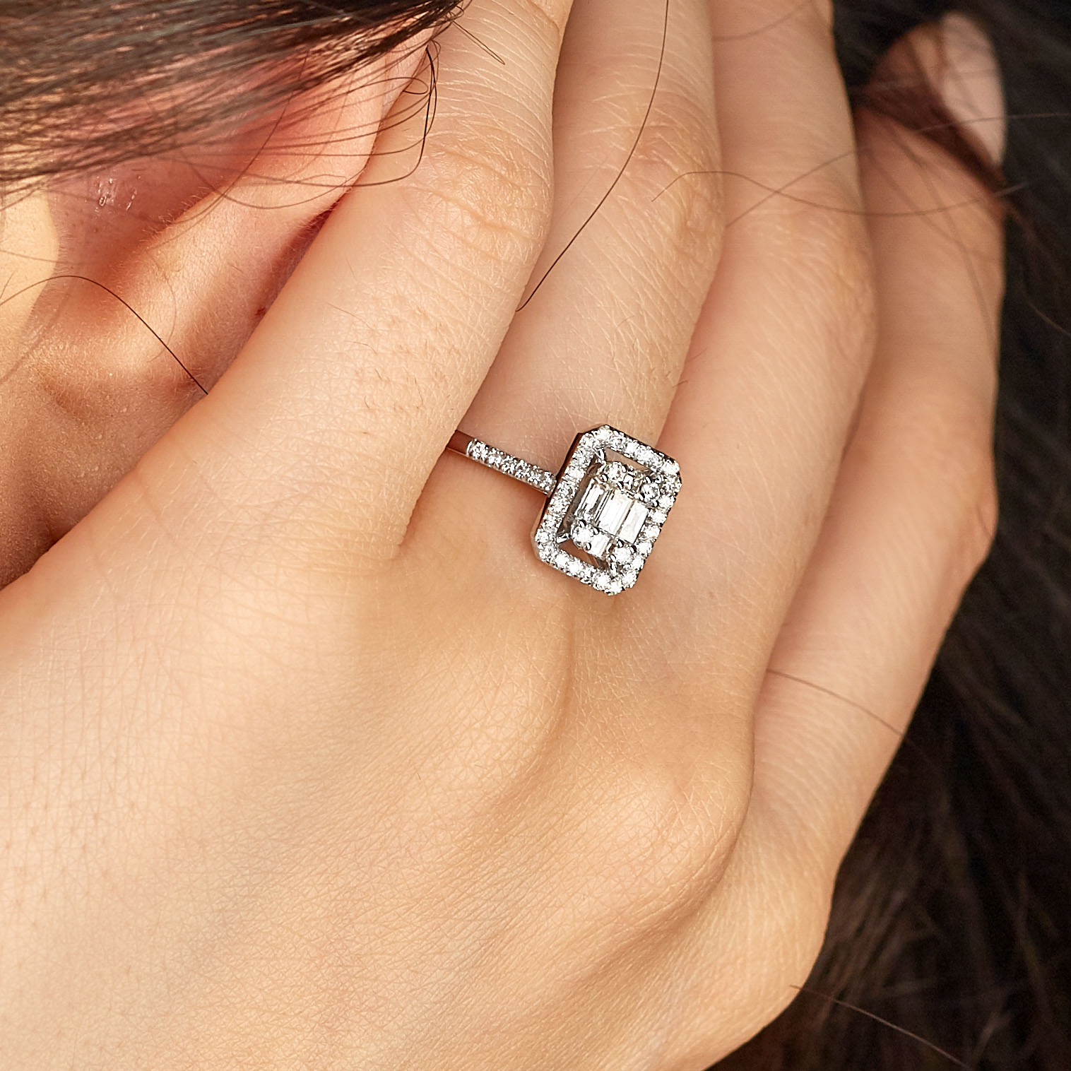 Ein funkelnder -MEINSCHMUCK- Diamantring aus 585er Gold wird von Brillanten in Baguette- und Brillantschliff gekrönt. Gehalten werden die Steine von einer quadratischen Fassung mit abgerundeten Kanten. Der Brillantbesatz setzt sich auf der Ringschiene fort. Die schmale Ringschiene gewährleistet ein angenehmes Tragegefühl. Er passt zu zahlreichen Stilrichtungen und zu besonderen Veranstaltungen – Sie werden begeistert sein! Insgesamt wird dieser Ring mit Brillanten ca. 0,44ct. geziert. Dieser wunderschöne Brillantring eignet sich auch wunderbar als Antragsring!