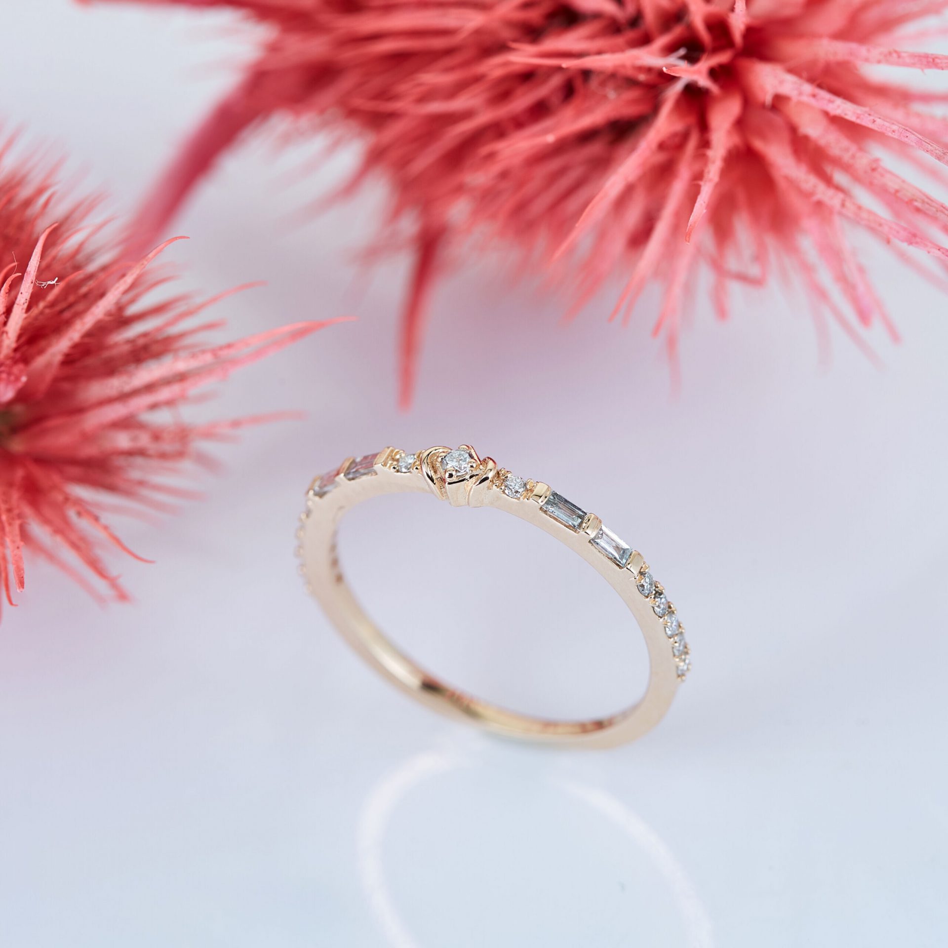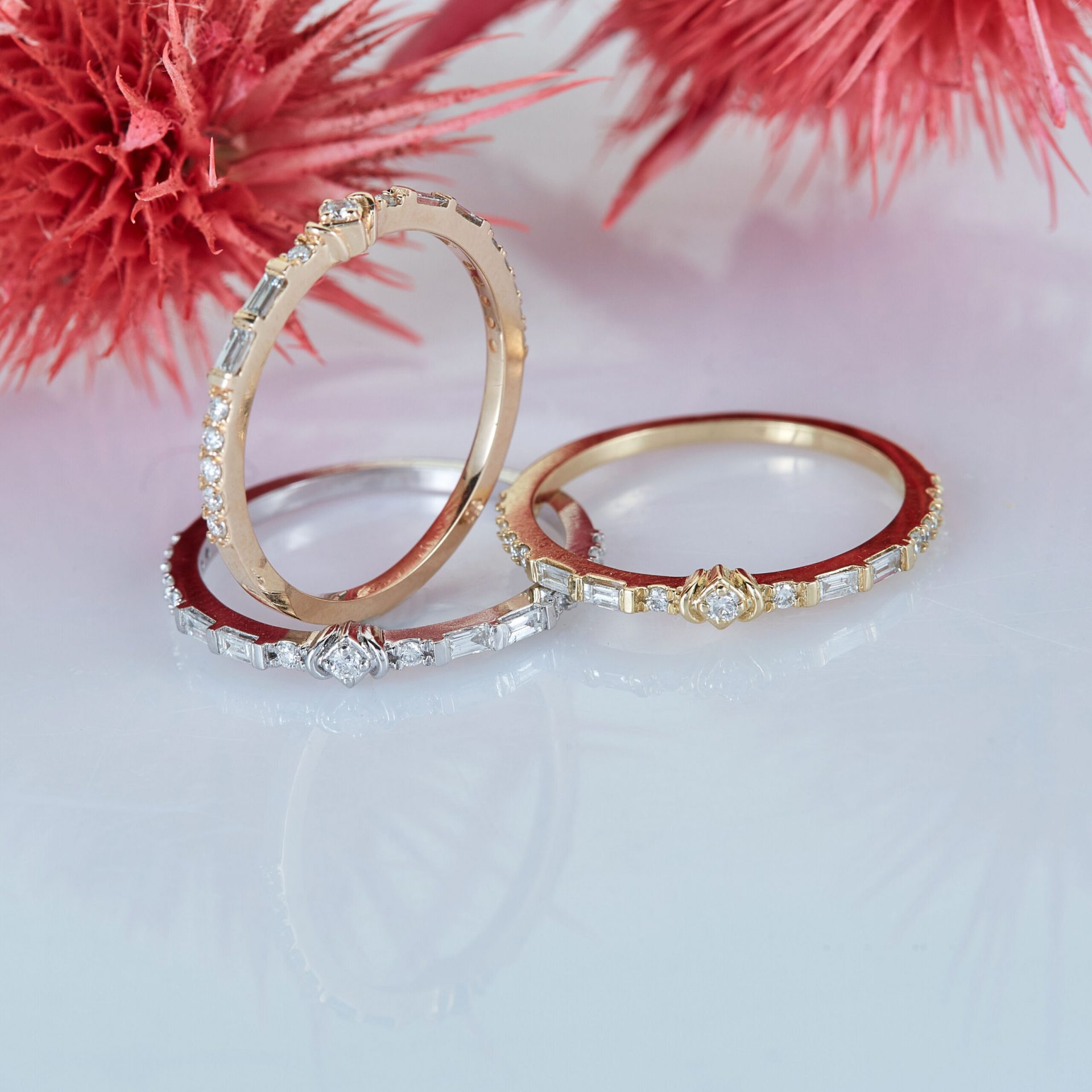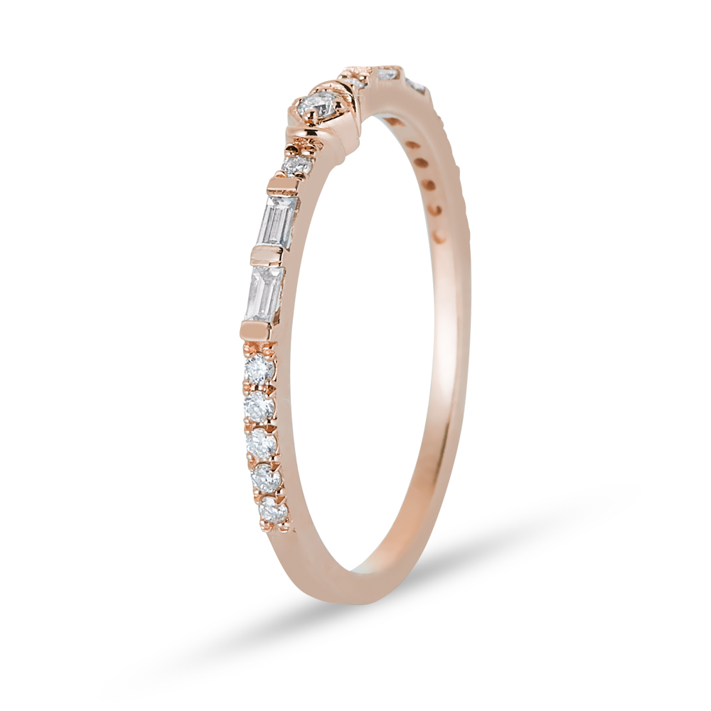 Ein einfarbiger Damenring im romantischen Design mit rotgoldenem Glanz. Die Verzierungen rücken die Zirkoniasteine im Brillantschliff und die Zirkoniasteine im Baguetteschliff perfekt in Szene. Die in der Ringschiene aus 585er Gold eingearbeiteten Zierelemente, in denen die Zirkoniasteine sitzen, sind mittig in einer Rauten-Form gehalten. Die Kombination aus modernem Rotgold, dem exklusiven Steinbesatz, macht aus dem filigranen Ring ein optisch abwechslungsreiches Schmuckstück, das zu zahlreichen Looks passen wird. Dieser Goldring ist in den Farben Gelbgold, Weißgold und Rotgold erhältlich.