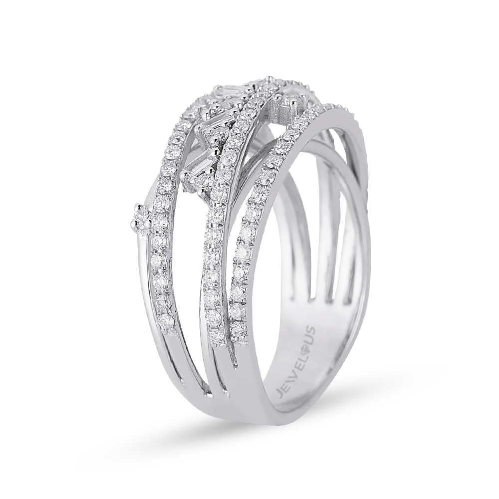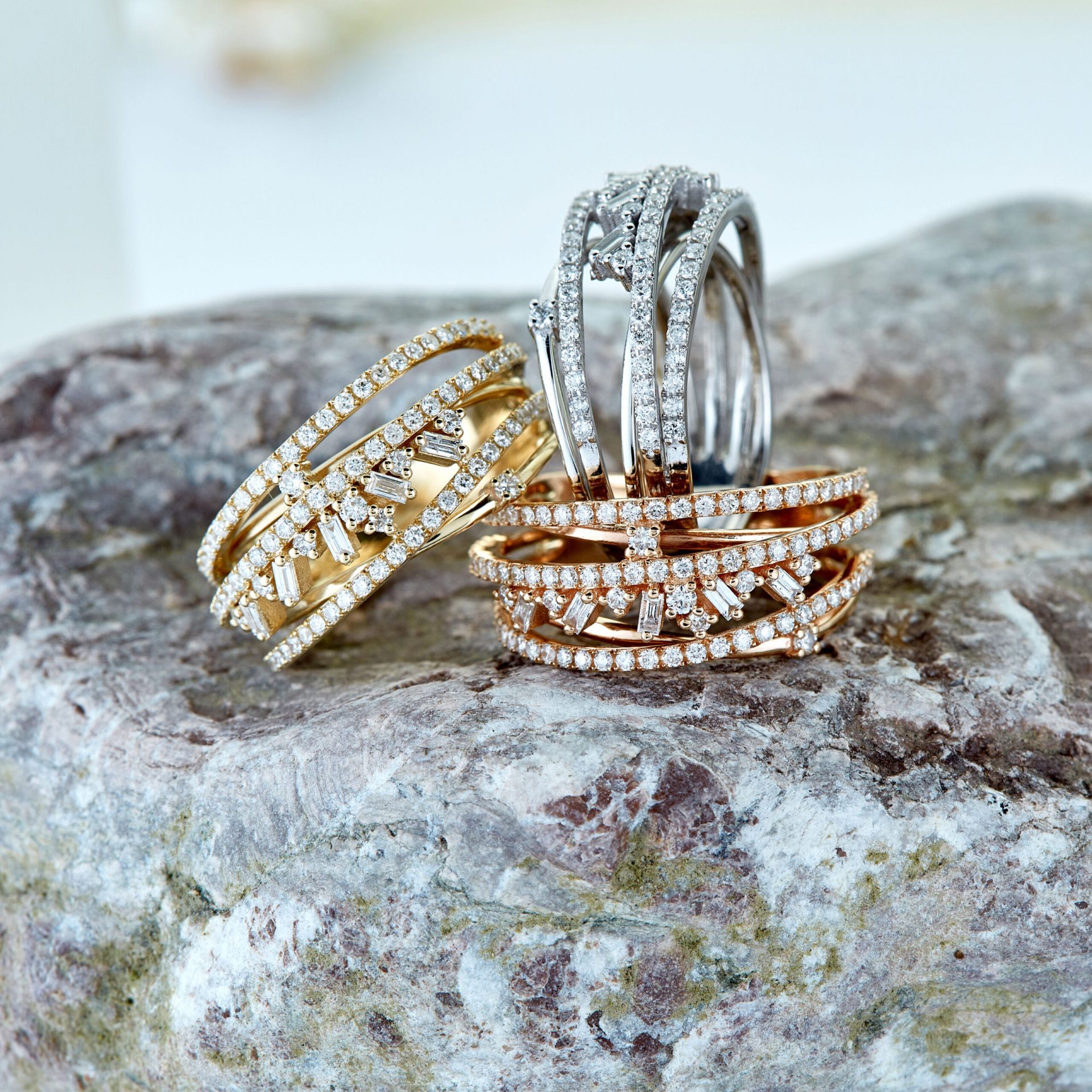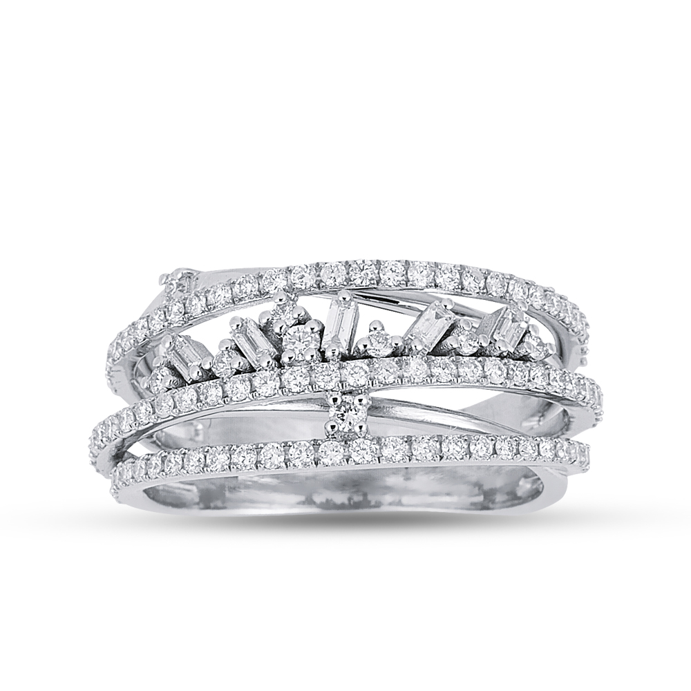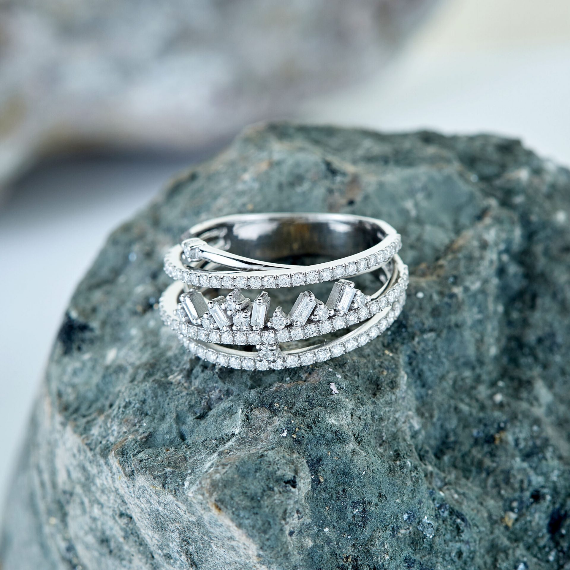 Ein besonderer Zirkoniaring mit herausstechendem Design in weißgoldenem Glanz aus 585er Gold. Die Zirkoniasteine im Brillant Schliff bringen die mittig verteilten Zirkoniasteine im Baguette Schliff perfekt in Szene. Die Ringschiene aus 585er Weißgold teilt sich im oberen Bereich mehrmals und macht den Ring zum Highlight – ein absolutes MUST HAVE! Die Kombination aus Form, modernem Weißgold, dem exklusiven Steinbesatz, macht aus dem Ring ein optisch abwechslungsreiches Schmuckstück, das zu zahlreichen Looks und Anlässen passen wird. Wir legen bei unserem Schmuck nur Wert auf eine exzellente Qualität. Dieser Goldring ist in den Farben Gelbgold, Weißgold und Rotgold erhältlich.