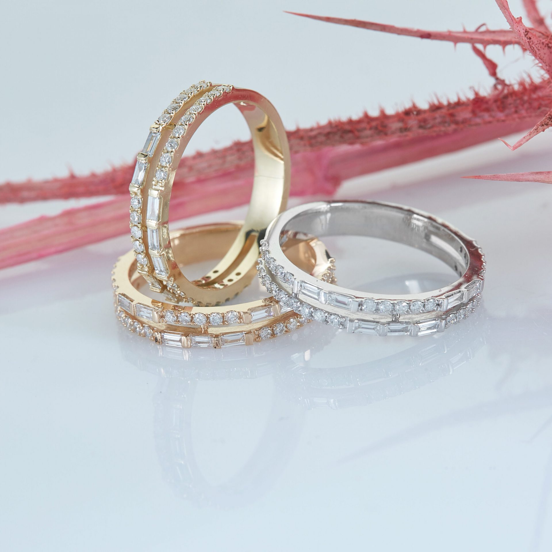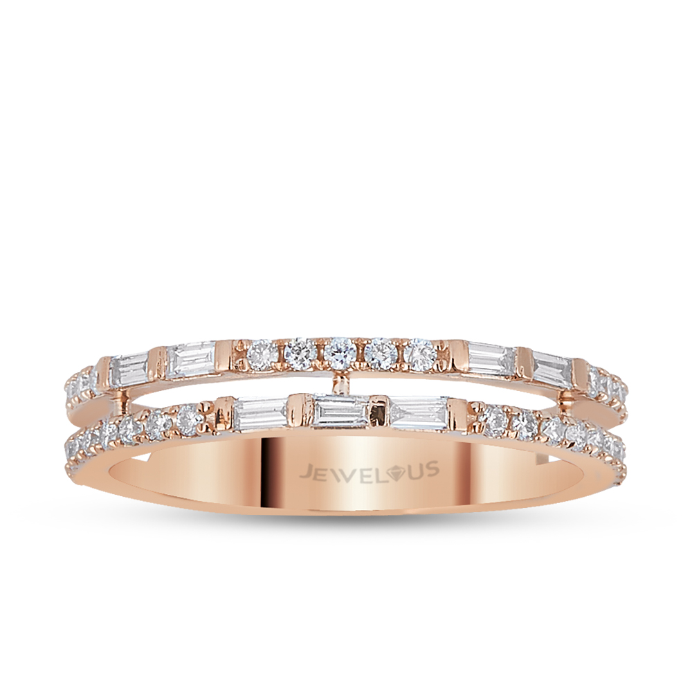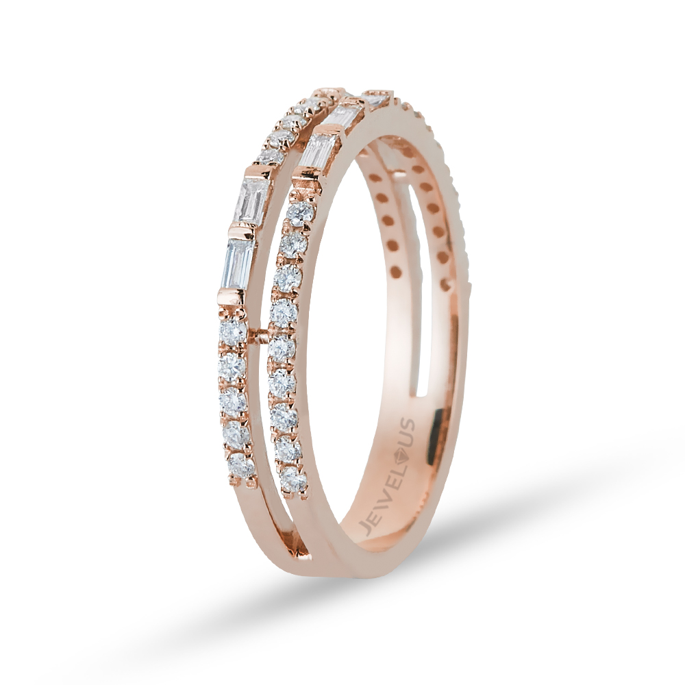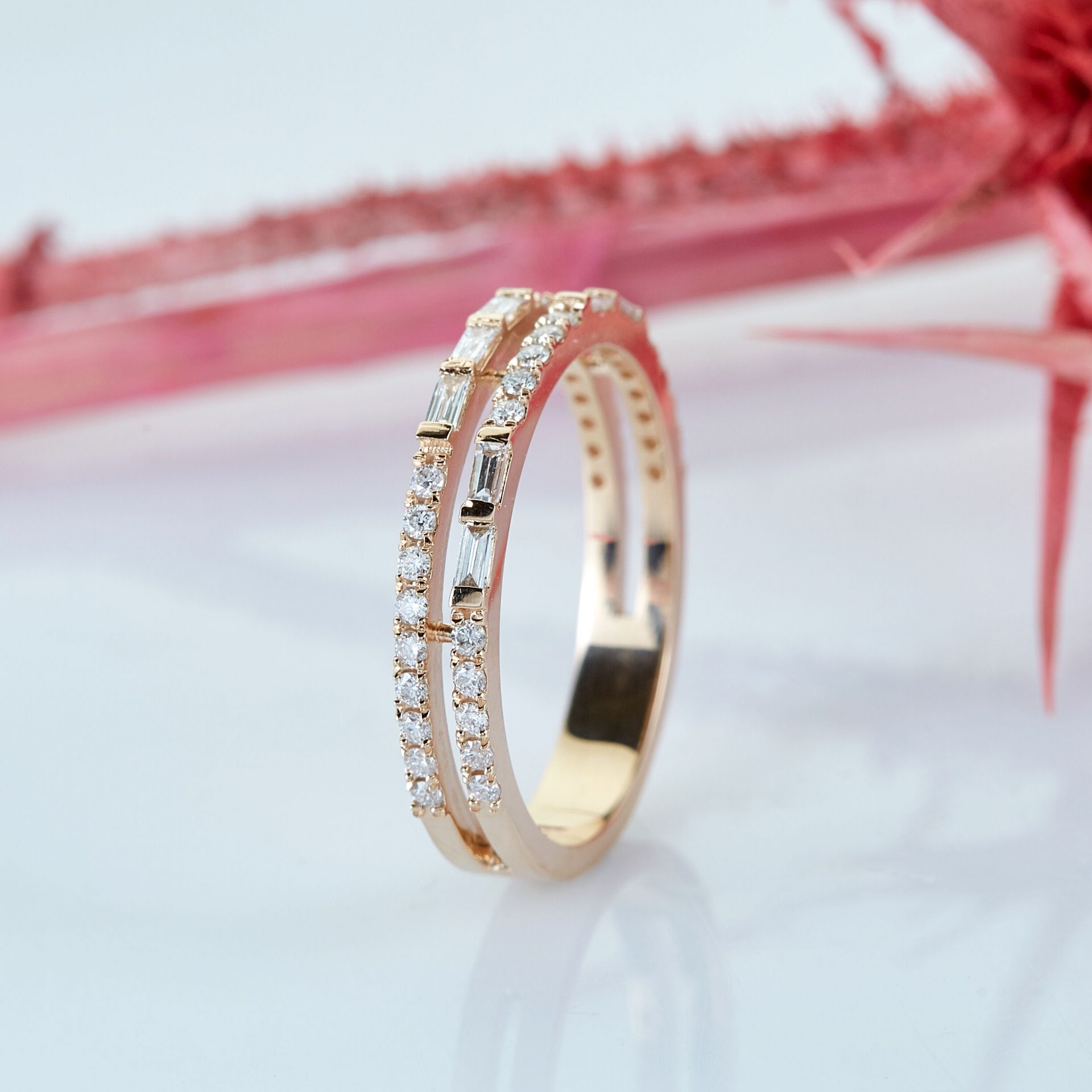 Ein einfarbiger MEINSCHMUCK Diamantring – ein absolutes Highlight – mit 585er Rotgoldenem Glanz und zweireihiger Ringschiene. Die Verschnittfassungen rückt die Diamanten ( ca. 0,39 ct. ) im Brillant- und Baguetteschliff perfekt in Szene. Diese Kombination aus der zweireihigen Ringschiene aus 585er Gold und dem exklusiven Steinbesatz, macht aus dem filigranen Ring ein optisch abwechslungsreiches Schmuckstück, das zu zahlreichen Looks passen wird. Wir legen bei unserem Diamantschmuck nur Wert auf eine exzellente Qualität. Dieser Goldring ist in den Farben Gelbgold, Weißgold und Rotgold erhältlich.