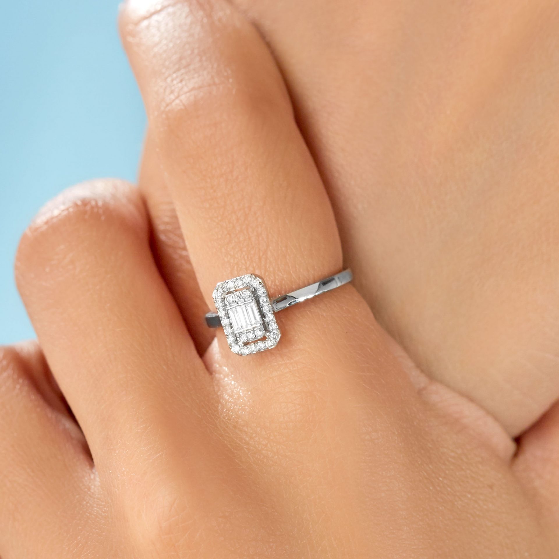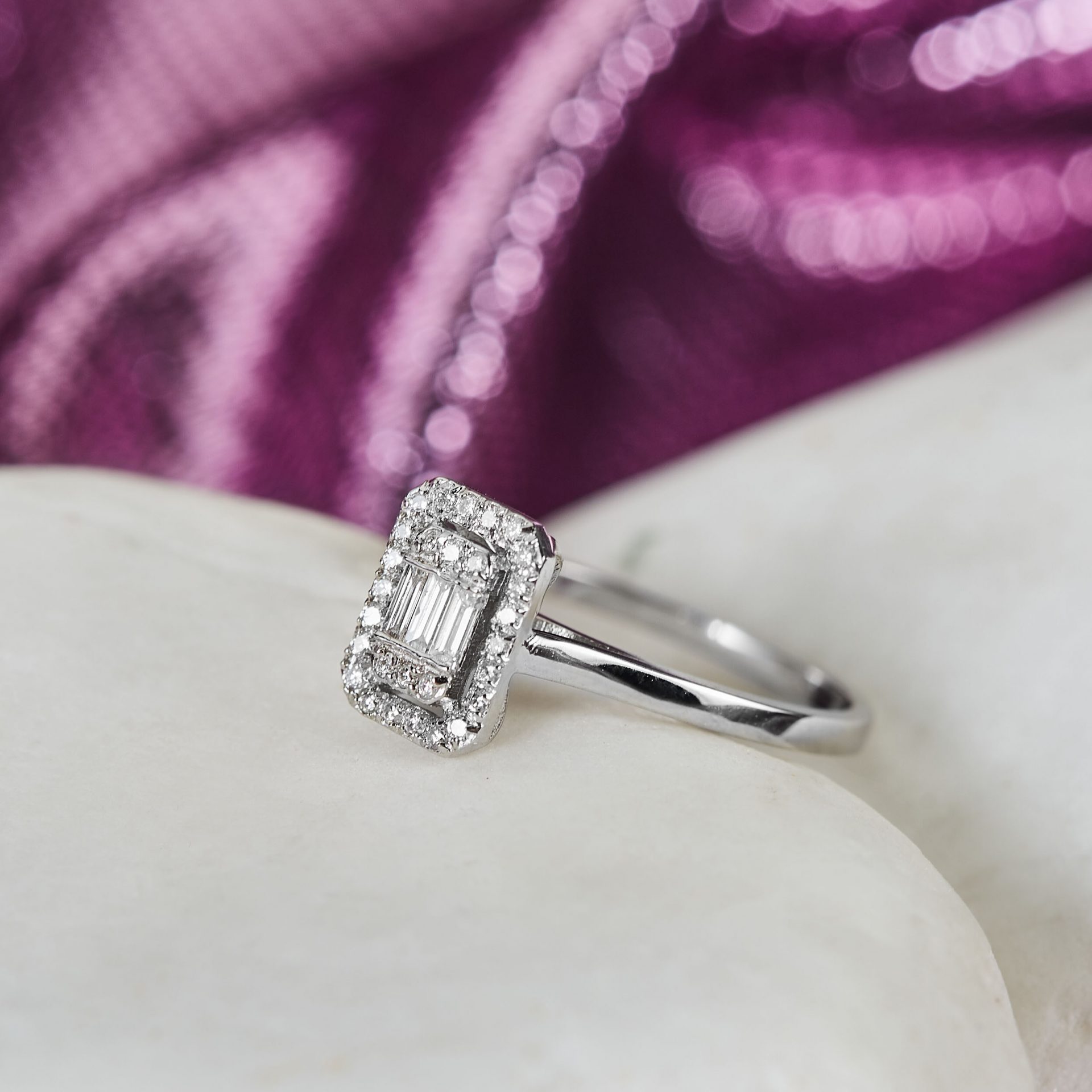 Ein funkelnder -MEINSCHMUCK- Diamantring aus 585er Gold wird von Brillanten in Baguette- und Brillantschliff gekrönt. Gehalten werden die Steine von einer quadratischen Fassung mit abgerundeten Kanten. Die schmale Ringschiene gewährleistet ein angenehmes Tragegefühl. Er passt zu zahlreichen Stilrichtungen und zu besonderen Veranstaltungen – Sie werden begeistert sein! Insgesamt wird dieser Ring mit Brillanten ca. 0,25ct. geziert. Dieser wunderschöne Brillantring eignet sich auch wunderbar als Antragsring!