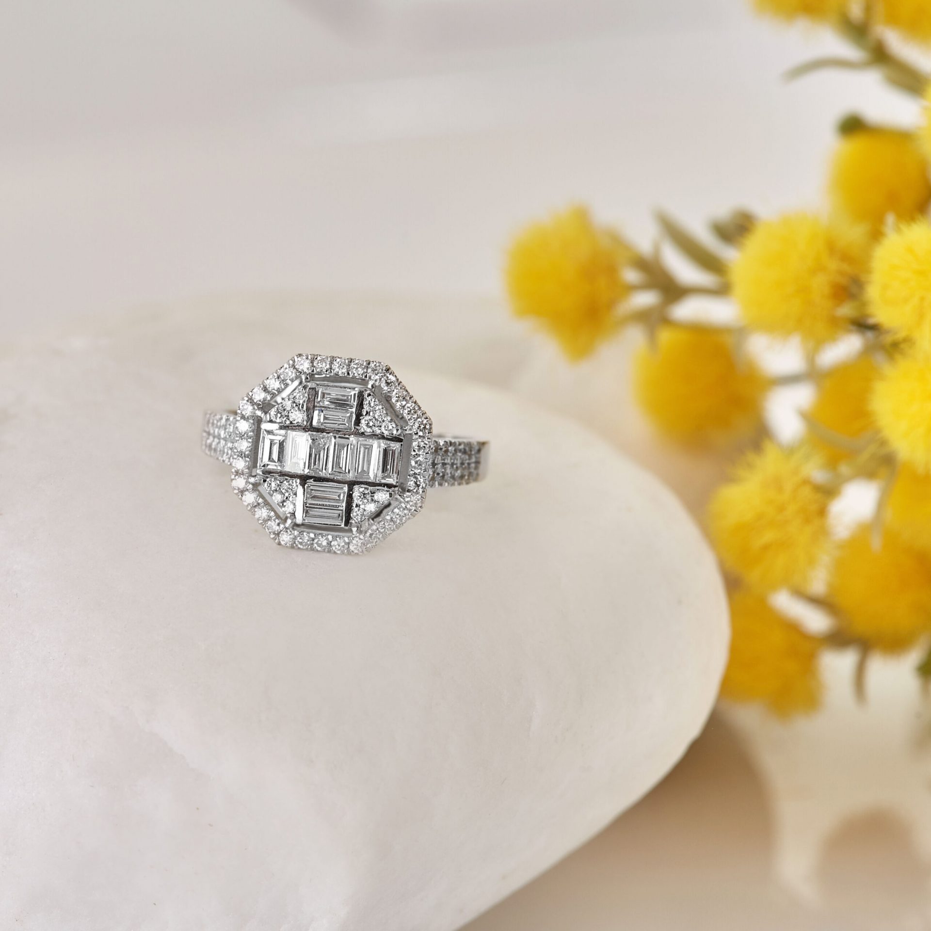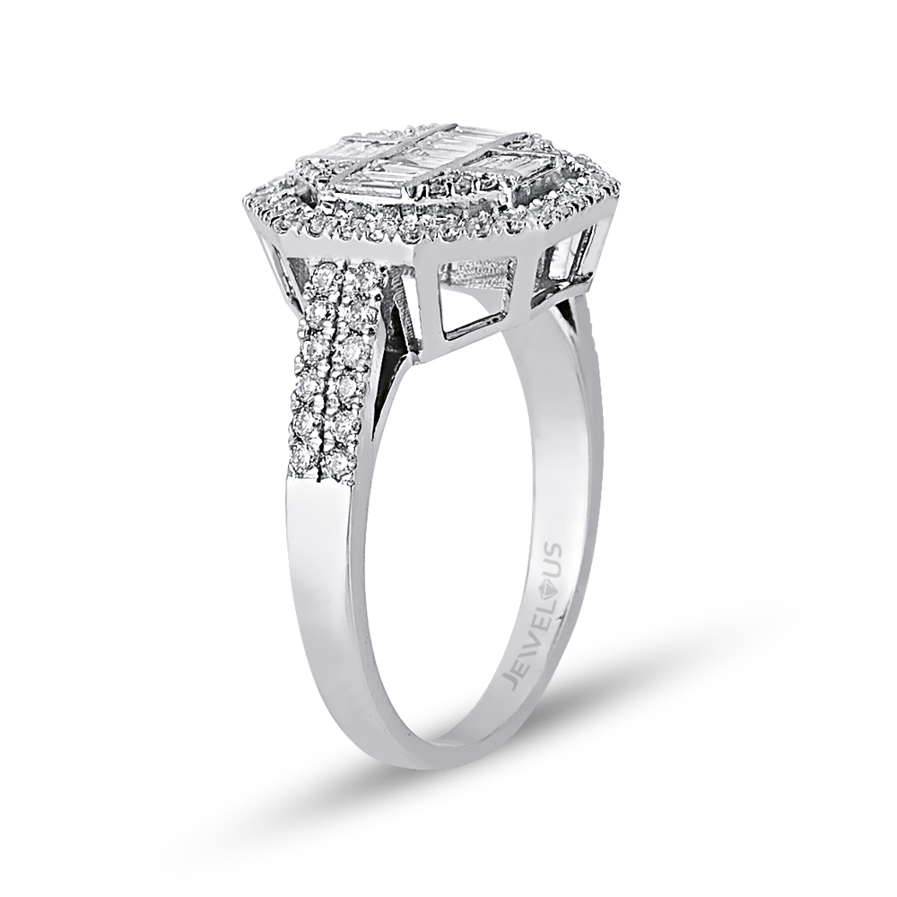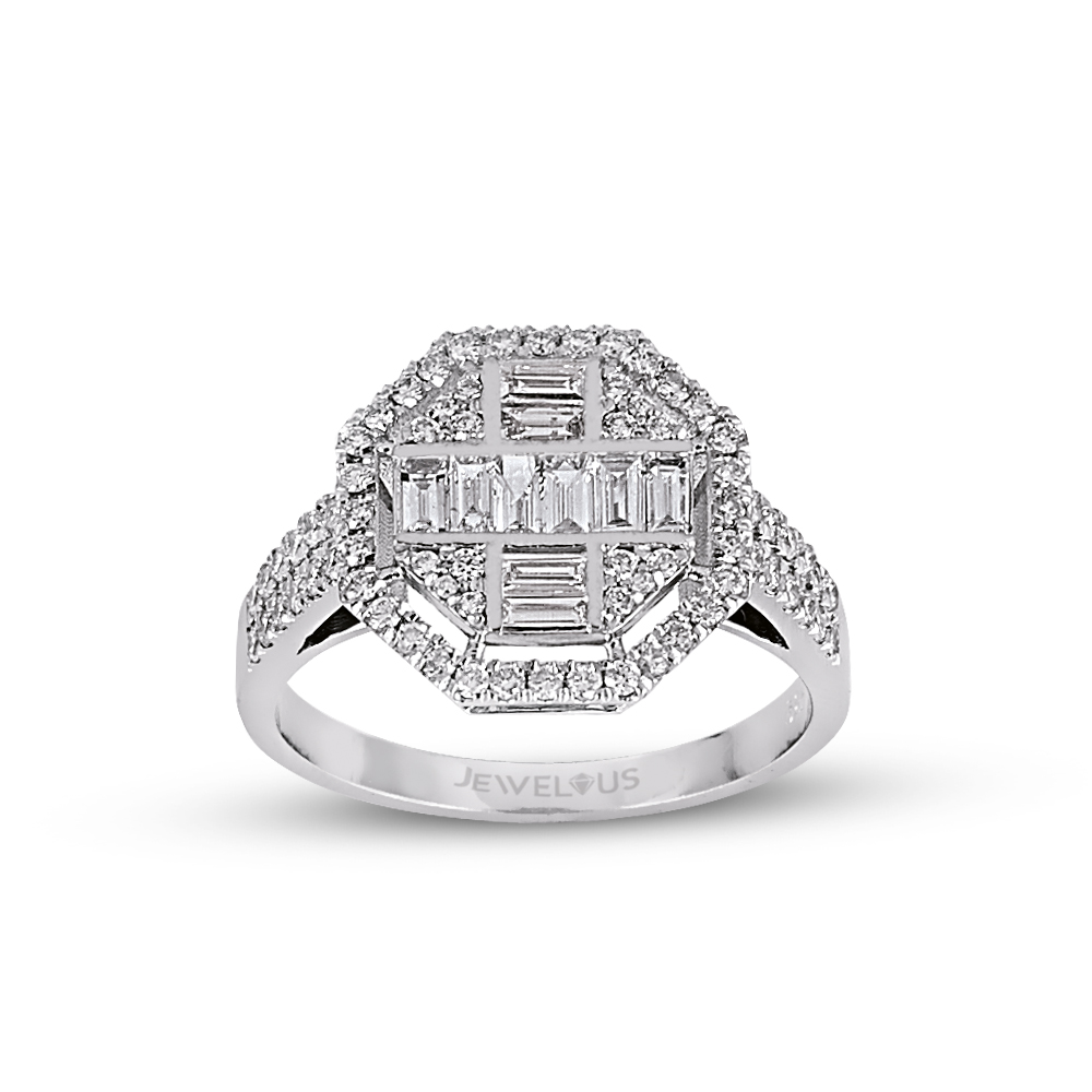 Ein funkelnder -MEINSCHMUCK- Weißgoldring aus 585er Gold wird von Zirkoniasteinen in Baguette- und Brillantschliff gekrönt. Gehalten werden die Steine von einer quadratischen Fassung mit abgerundeten Kanten. Die schmale Ringschiene gewährleistet ein angenehmes Tragegefühl. Er passt zu zahlreichen Stilrichtungen und zu besonderen Veranstaltungen – Sie werden begeistert sein! Dieser wunderschöne Ring eignet sich auch wunderbar als Antragsring!