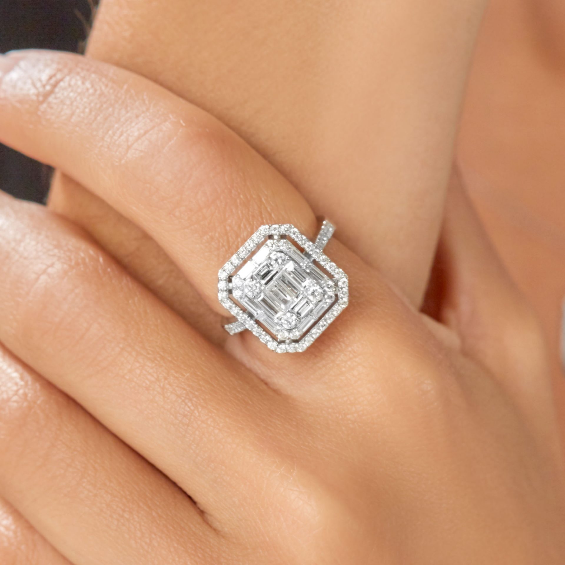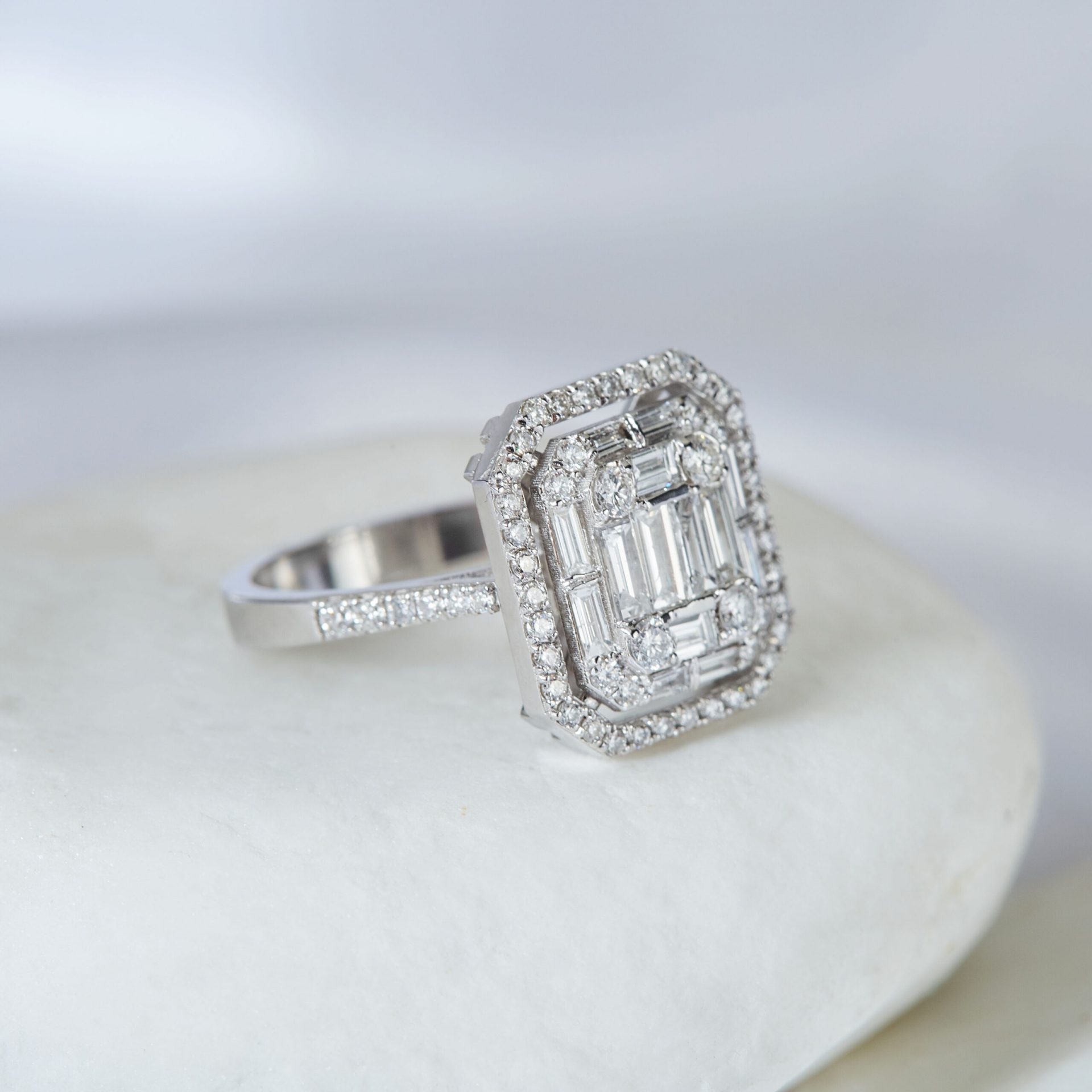 MEINSCHMUCK- Damenring aus 585er Gold wird von Zirkoniasteinen in Baguette- und Brillantschliff gekrönt. Gehalten werden die Steine von einer quadratischen Fassung mit abgerundeten Kanten. Der Zirkoniabesatz setzt sich auf der Ringschiene fort. Die schmale Ringschiene gewährleistet ein angenehmes Tragegefühl. Er passt zu zahlreichen Stilrichtungen und zu besonderen Veranstaltungen – Sie werden begeistert sein!
