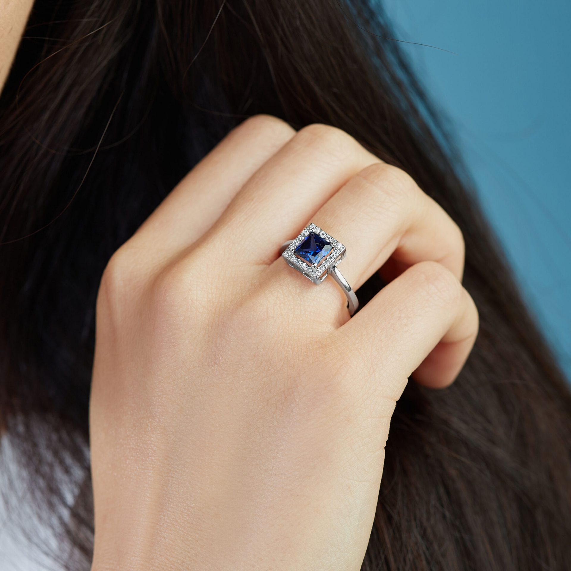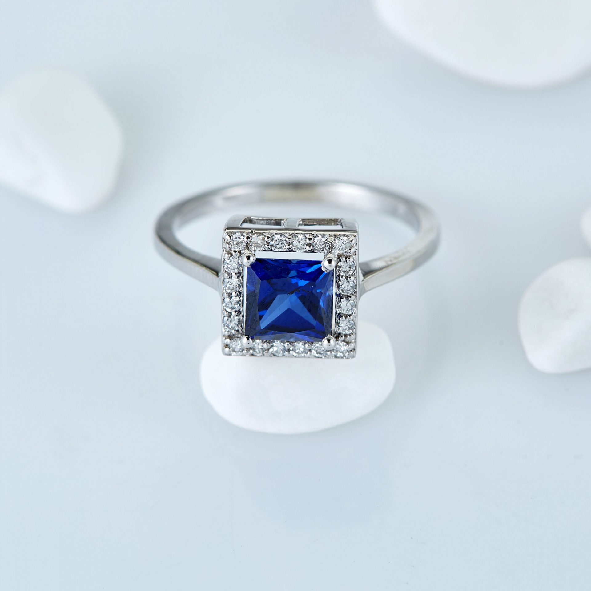 Ein formvollendet schöner -MEINSCHMUCK- Verlobungsring / Diamant / Saphir Ring aus 585er Weißgold. Klar strahlende Diamanten ( ca. 0,17 ct. ) im Brillantschliff bringen den zentralen Saphir ( ca. 1,48 ct. )in Princess Schliff zusätzlich zum Strahlen. Diese schöne Kombination macht aus dem filigranen Ring ein optisch abwechslungsreiches Schmuckstück, das zu zahlreichen Looks passen wird. Wir legen bei unserem Diamantschmuck nur Wert auf eine exzellente Qualität. Die schmale Ringschiene gewährleistet ein angenehmes Tragegefühl. Dieser wunderschöne Diamant Ring eignet sich wunderbar als Verlobungsring oder als Geschenk! Zudem besteht die Möglichkeit die Innenseite des Ringes mit einer Gravur versehen zu lassen.