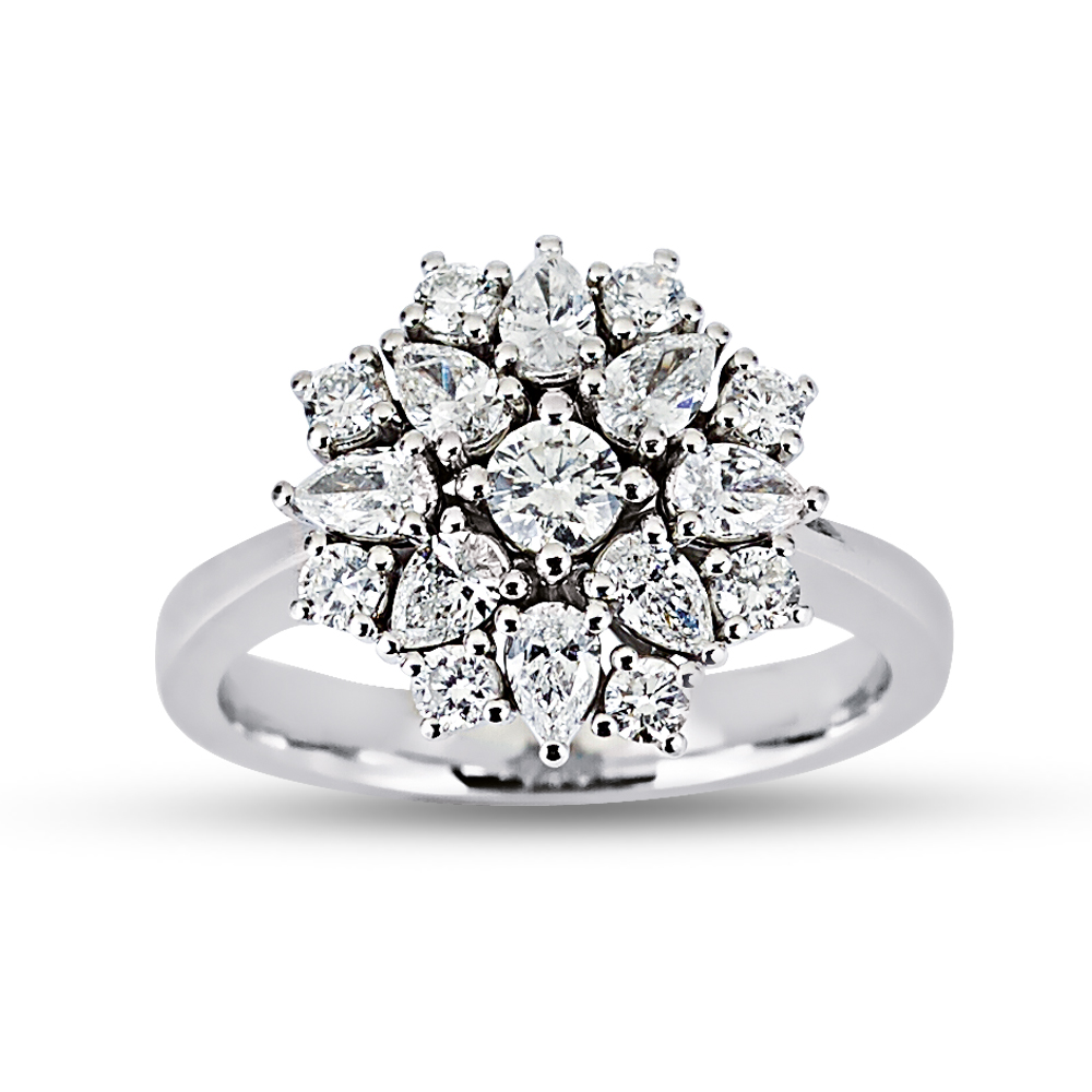Formvollendet schön – dieser MEINSCHMUCK Goldring aus 585er Weißgold geziert mit Brillanten in Blumenform. Der funkelnder Eyecatcher ist der Blumenform-Ringkopf, er wird von Brillanten (ca. 1,06 ct.) im Tropfen- und Brillantschliff geziert. Dieser raffinierte Kontrast wird bewundernde Blicke magisch anziehen. Die hochwertigen Materialien und die präzise Verarbeitung sorgen dafür, dass Sie lange Freude an diesem Ring haben werden. Die schmale Ringschiene sorgt für ein angenehmes Tragegefühl. Dieser wunderschöne Brillantring eignet sich auch wunderbar als Geschenk!