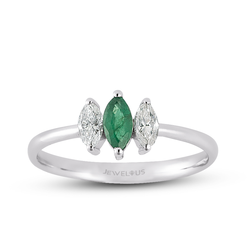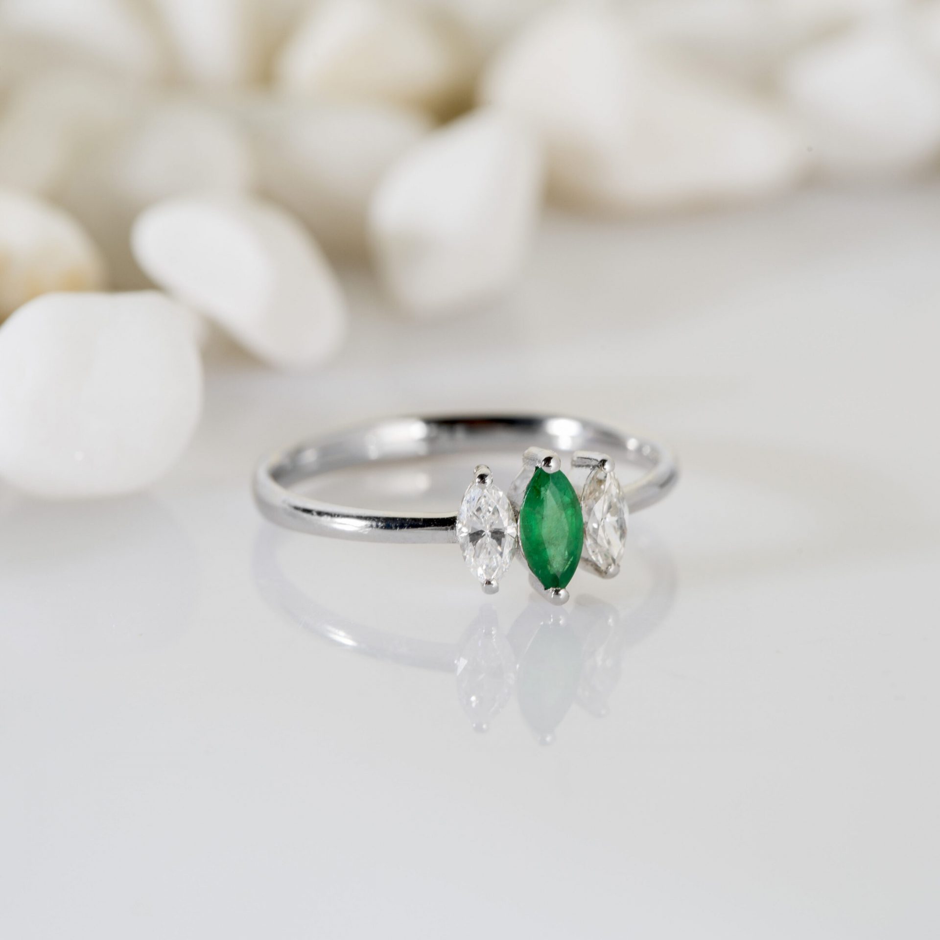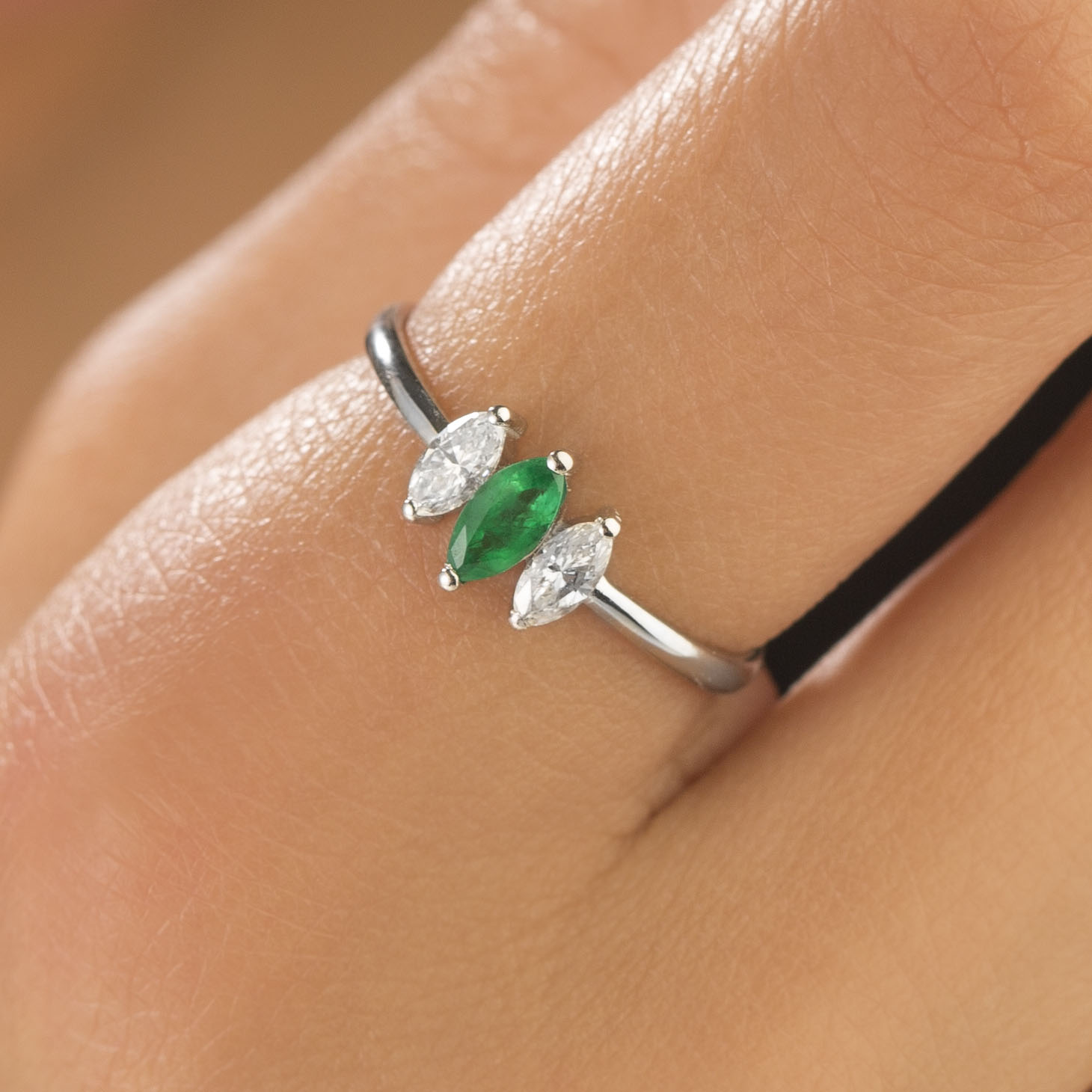 Ein feligraner -MEINSCHMUCK- Damenring aus 585er Weißgold mit zwei schönen Zirkoniasteinen in Marquise Schliff und einem grünem Zirkoniastein in Marquise Schliff im Fokus! Die außen leicht gewölbte Ringschiene gewährleistet ein angenehmes Tragegefühl – Sie werden begeistert sein. Dieser wunderschöne Ring eignet sich auch wunderbar als Geschenk!