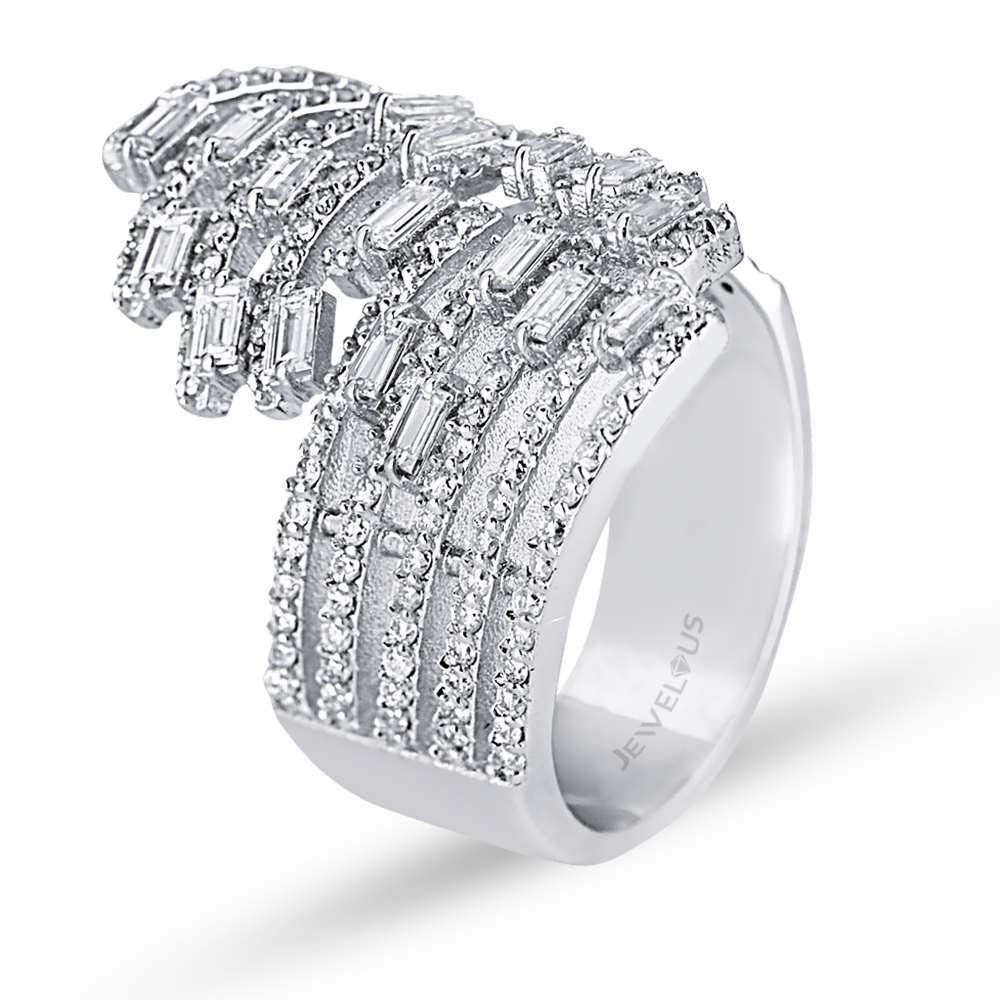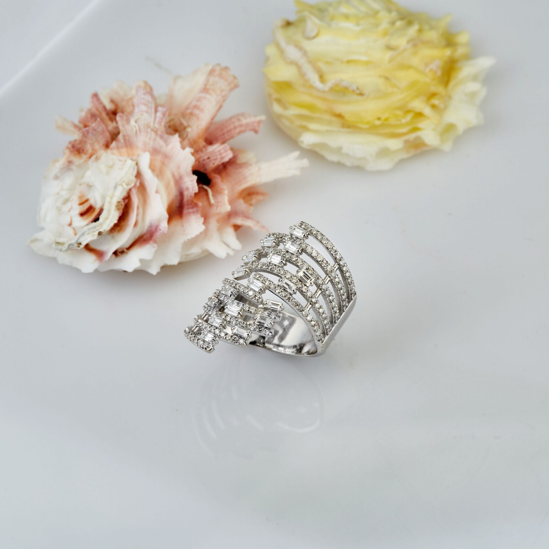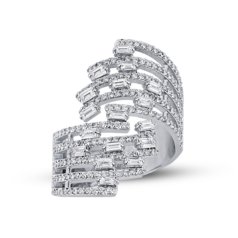 Ein extravanganter -MEINSCHMUCK- Zirkonia Ring aus 585er Gold mit Steinen in Baguette- und Brillantschliff. Auf der mehrreihigen Ringschiene dieses Rings aus 585er Weißgold versammeln sich mehrere Zirkoniasteine. Er passt zu zahlreichen Stilrichtungen und zu besonderen Veranstaltungen – Sie werden begeistert sein! Dieser wunderschöne Ring eignet sich wunderbar als Geschenk!