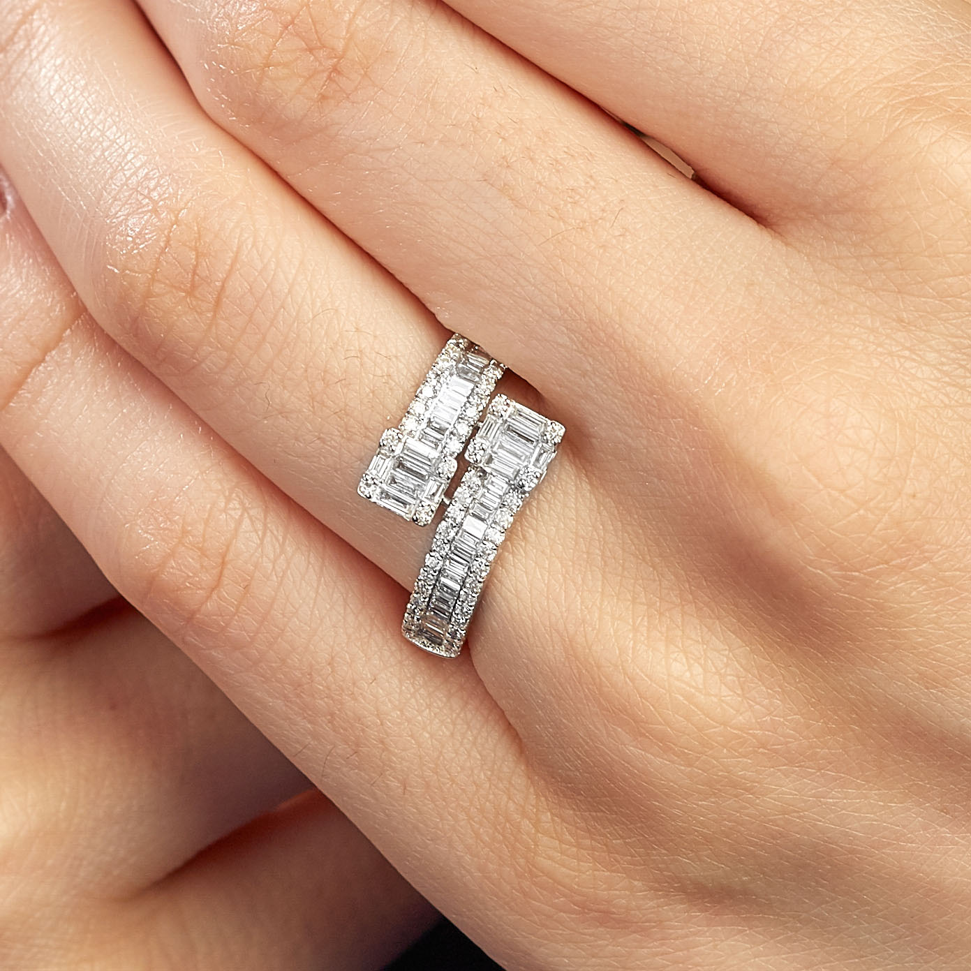 MEINSCHMUCK Ring mit offner Ringschiene und Zirkoniasteinen Steinbesatz. Die offene zueinanderlaufende Ringschiene aus 585er Weißgold ist am Ende jeweils mit Elementen in quadratischer Form geziert. Dieser Goldring ist mit Brillanten im Brillant- und Baguetteschliff bestückt. Zudem wird etwa die Hälfte der Ringschiene von strahlend weißen Zirkoniasteinen geziert. Die schmale Ringschiene gewährleistet ein angenehmes Tragegefühl. Ein MUST HAVE, mach diesen Ring zu Deinem!
