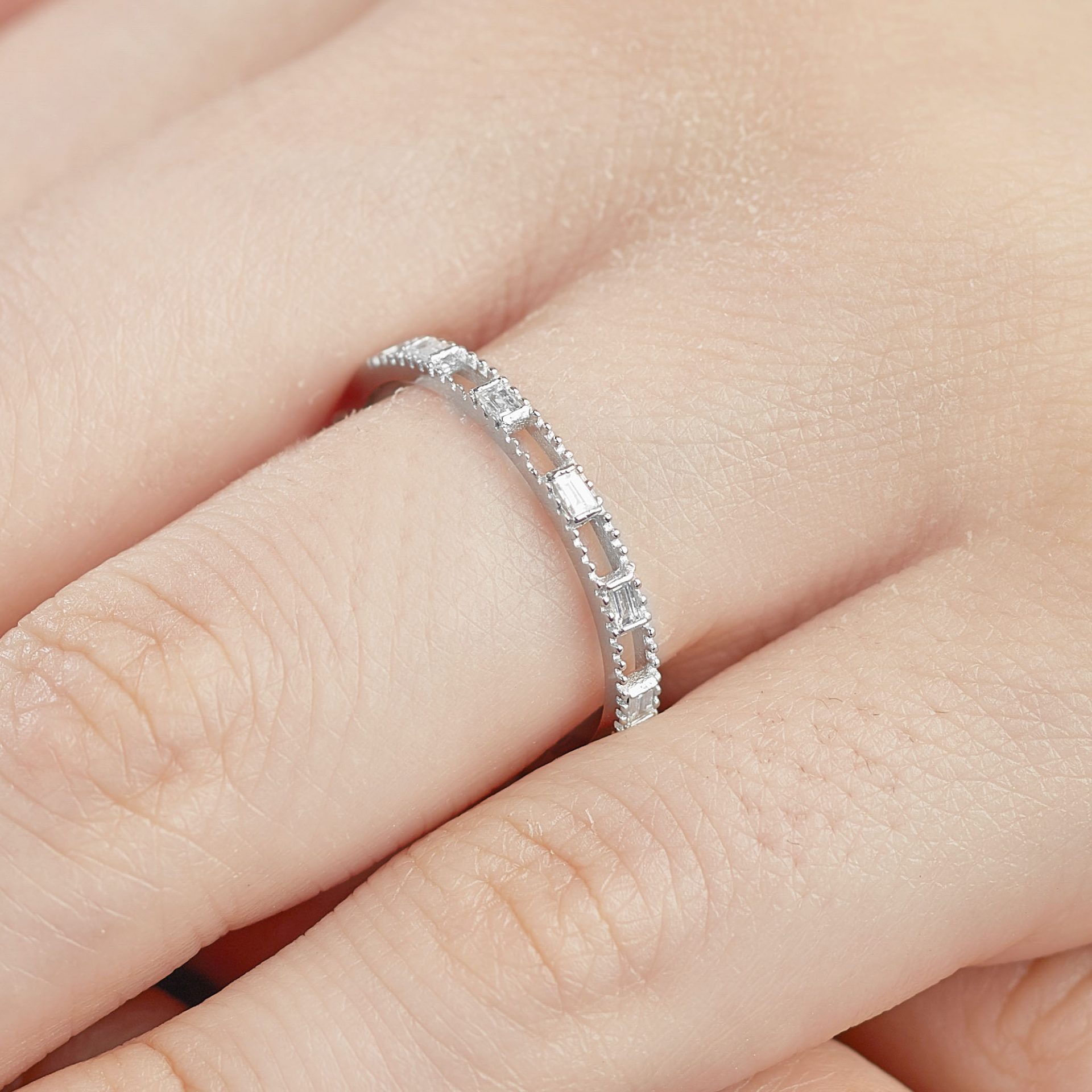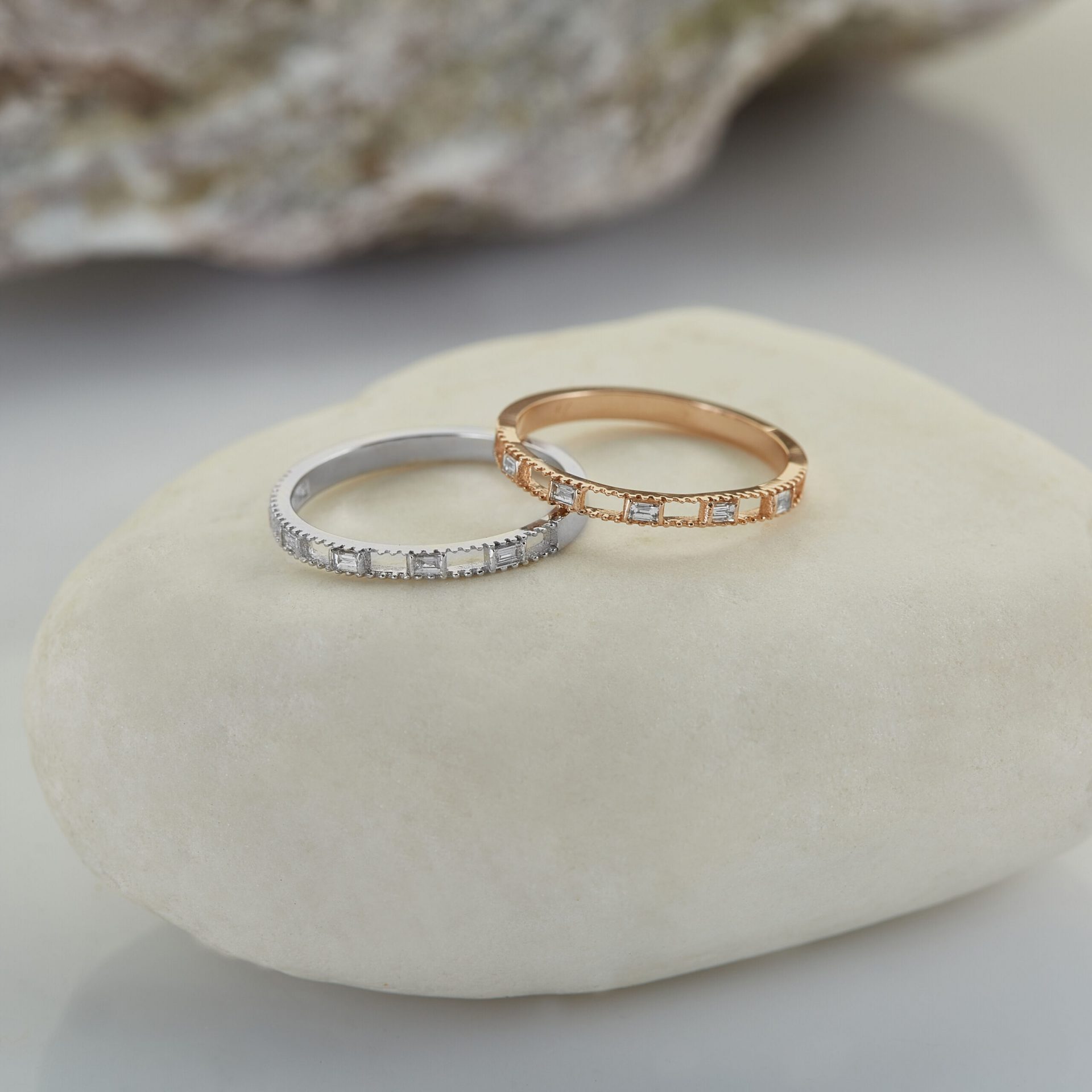 Ein feligraner Blickfang dieser – MEINSCHMUCK- Damenring aus elegantem 585er Gold im Milgrain-Stil. Das Schmuckstück wird von funkelnden Zirkoniasteinen im Baguetteschliff geziert und wird garantiert für einen Blickfang sorgen. Der Allroundstar lässt sich toll mit anderen Kostbarkeiten kombinieren und eignet sich als Krönung für besondere Momente. Die schmale Ringschiene gewährleistet ein angenehmes Tragegefühl. Dieser wunderschöne Ring eignet sich wunderbar als Geschenk oder Sie machen sich selbst eine Freude! Dieser Ring ist in Weißgold und Rotgold erhältlich.